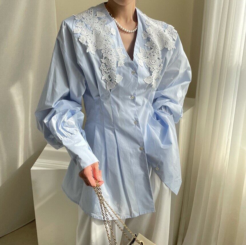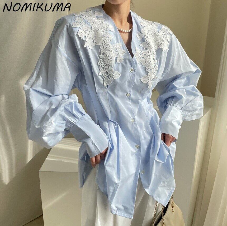 Nomikuma シックなレースパッチワーク V ネックブラウス女性パフ長袖トップシャツ 2022 秋スリムウエスト ロング オータム 秋物 Vネック kor60660712665