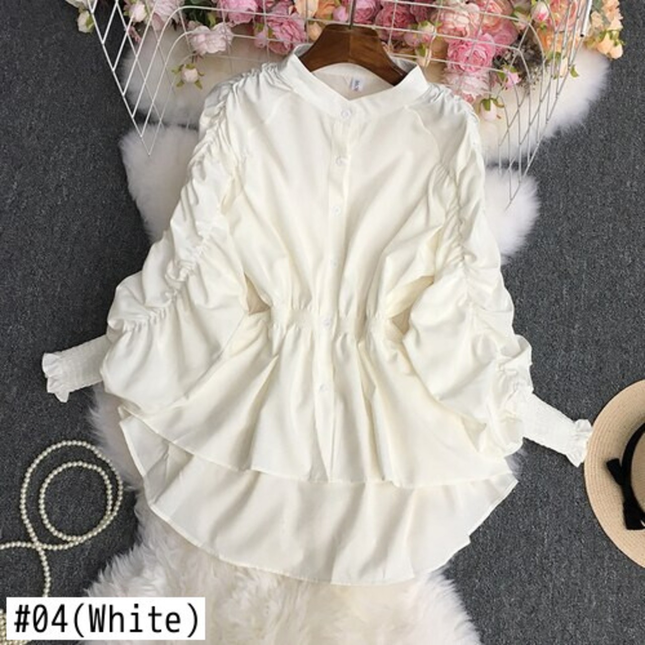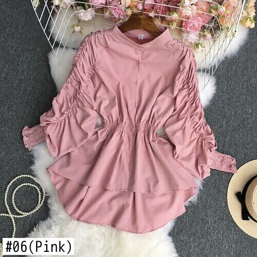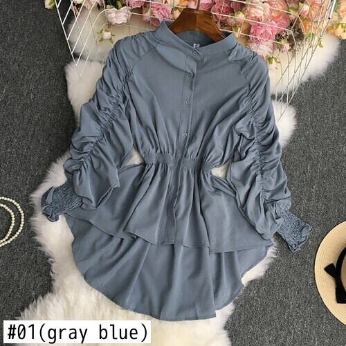 ノミクマシャーリングパフ長袖ブラウスシャツ無地シングルブレストスタンドネックレディーストップス秋デ ロング オータム 秋物 ソリッドカラー kor68137033341