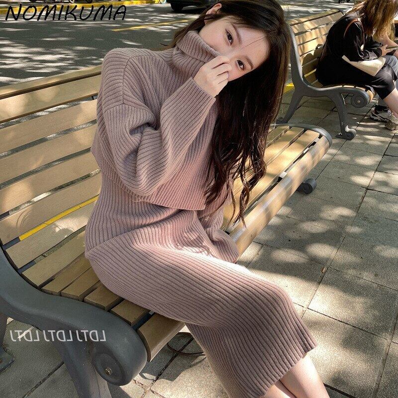 Nomikuma 秋冬二枚女性ニットセット長袖タートルネックプルオーバーセーター + スリム Baisc タンクドレス 2022 ロング オータム 秋物 ウィンター 冬物 kor41058611069