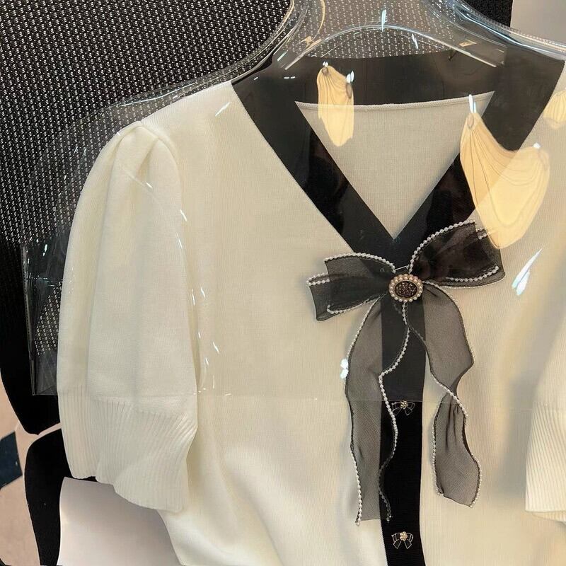 Nomikuma 甘いちょう結びシックなショートニット女性 2022 パフスリーブコントラストカラー V ネックプルオーバーニットトップス リボン 大人ガーリー スウィート キュート カジュアル Vネック kor90718793862