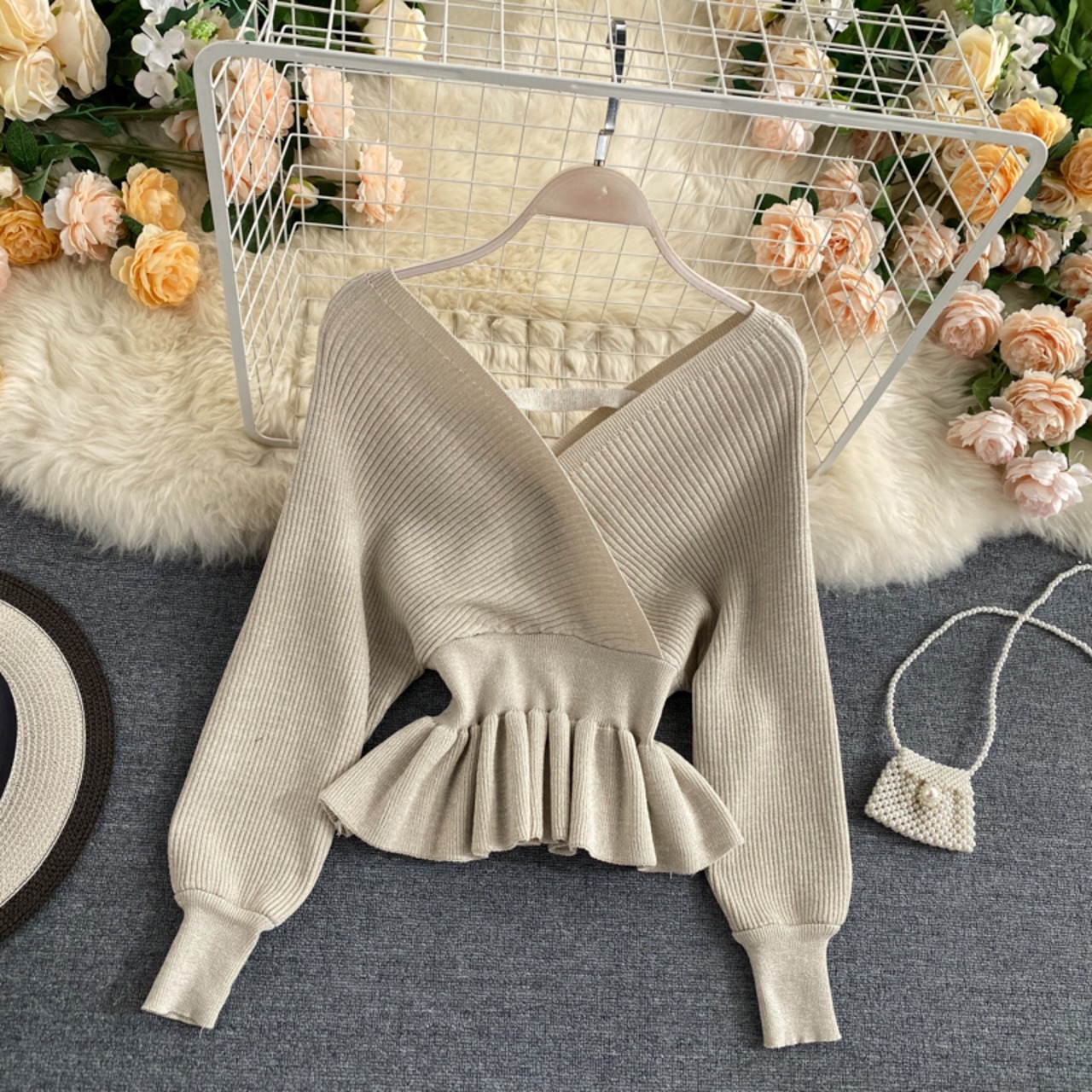 Nomikuma セーター女性春秋の V ネックスリムウエストチュニックフリル裾シックなセーター気質セーター Feminino ラッフル スプリング 春物 オータム 秋物 Vネック kor80861450235