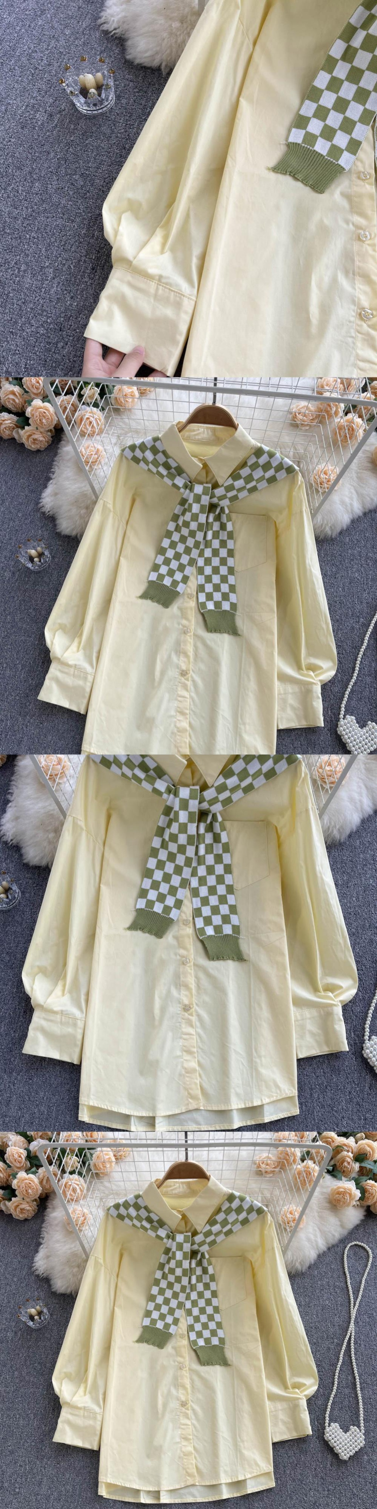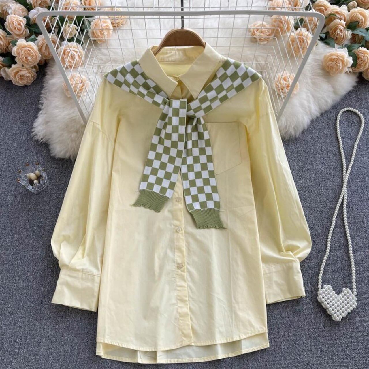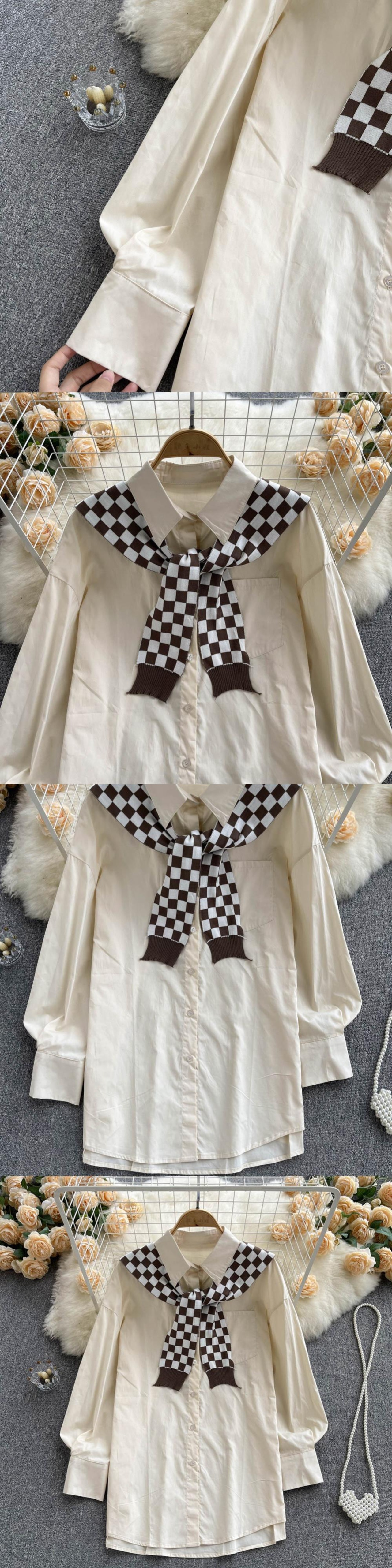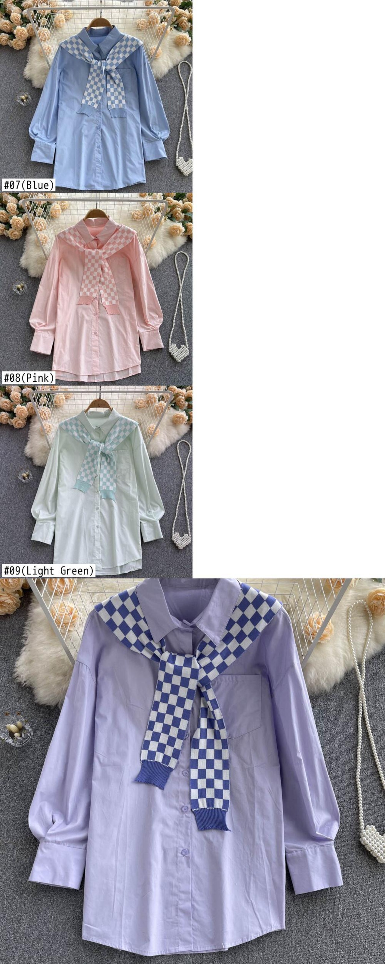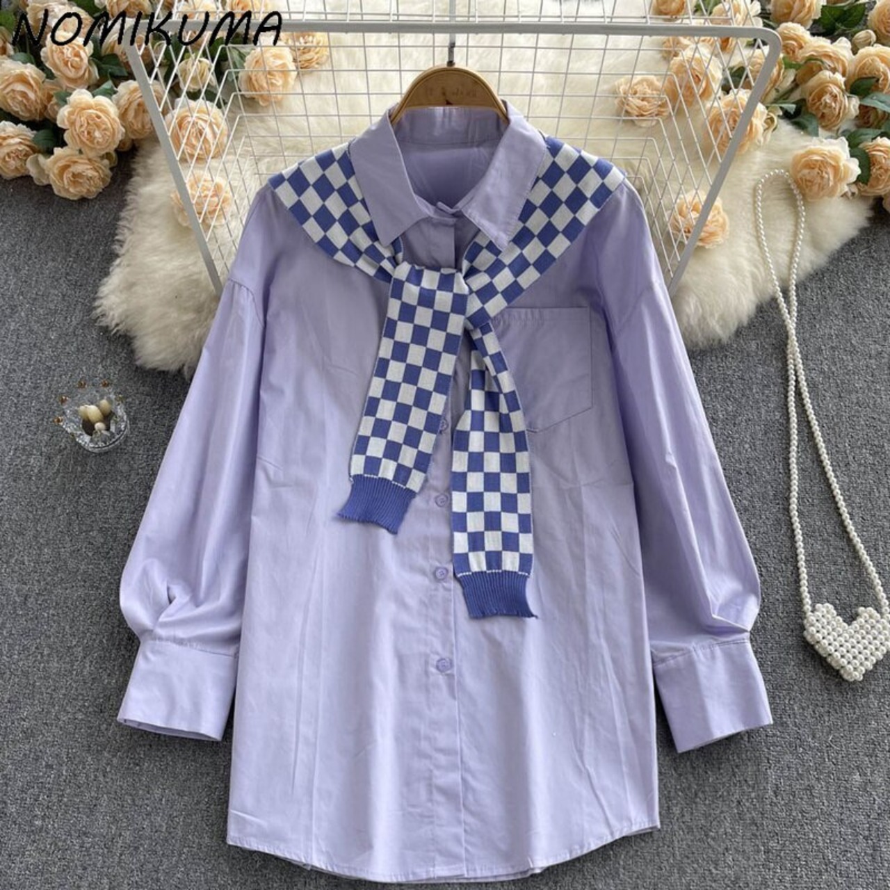 Nomikuma レディース ブラウス スタイル チェック柄ショール + 長袖ターンダウンカラー無地シャツ 2022 秋 2 ピース ロング オータム 秋物 ソリッドカラー kor20427434772