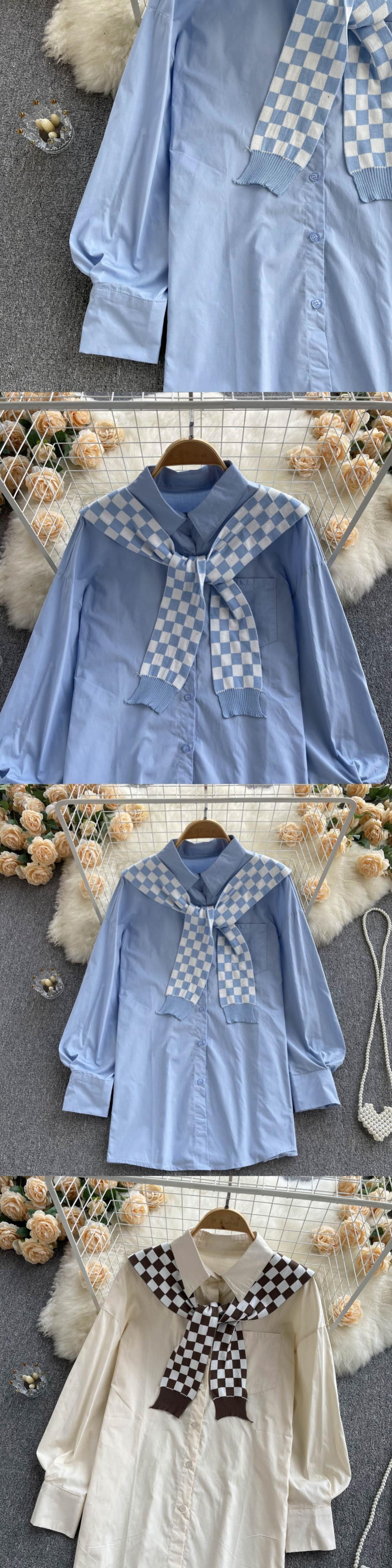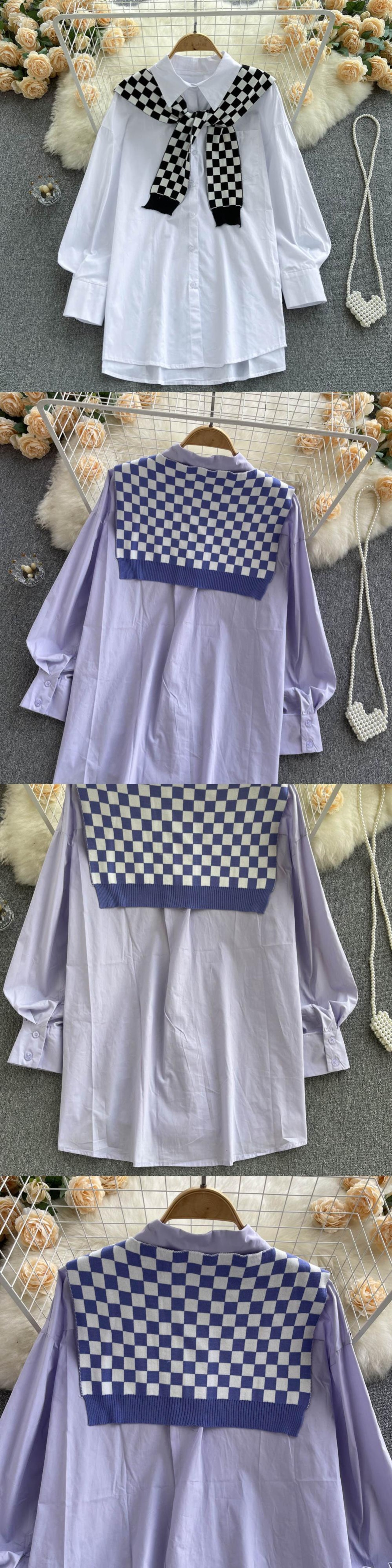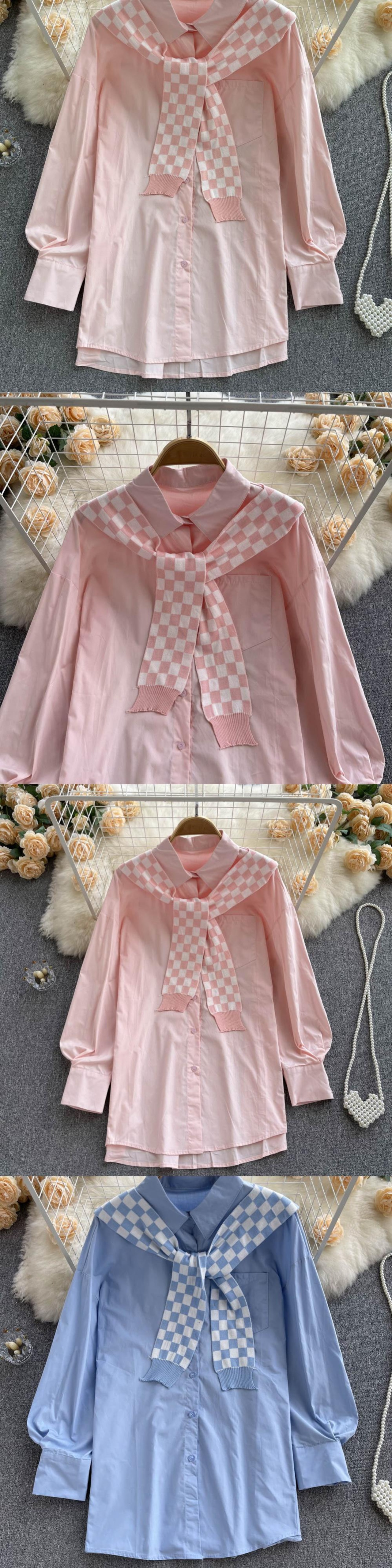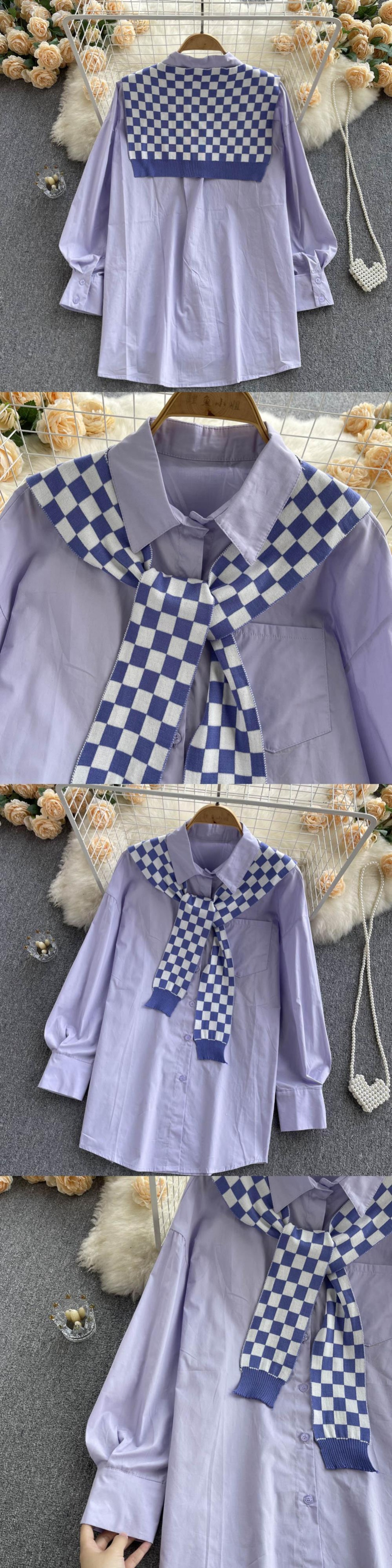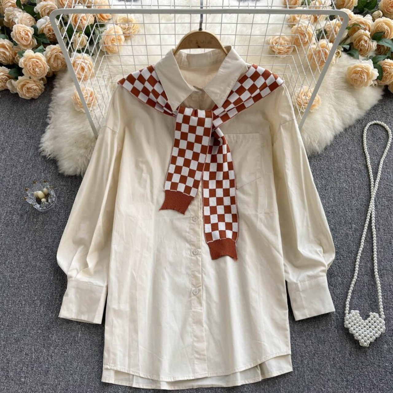 Nomikuma レディース ブラウス スタイル チェック柄ショール + 長袖ターンダウンカラー無地シャツ 2022 秋 2 ピース ロング オータム 秋物 ソリッドカラー kor20427434772
