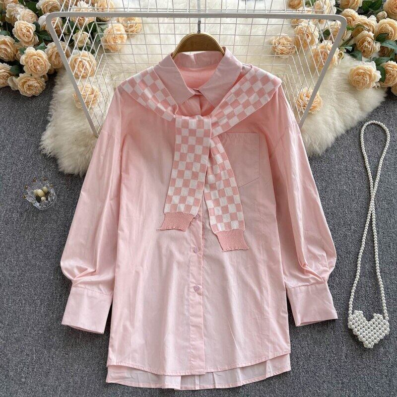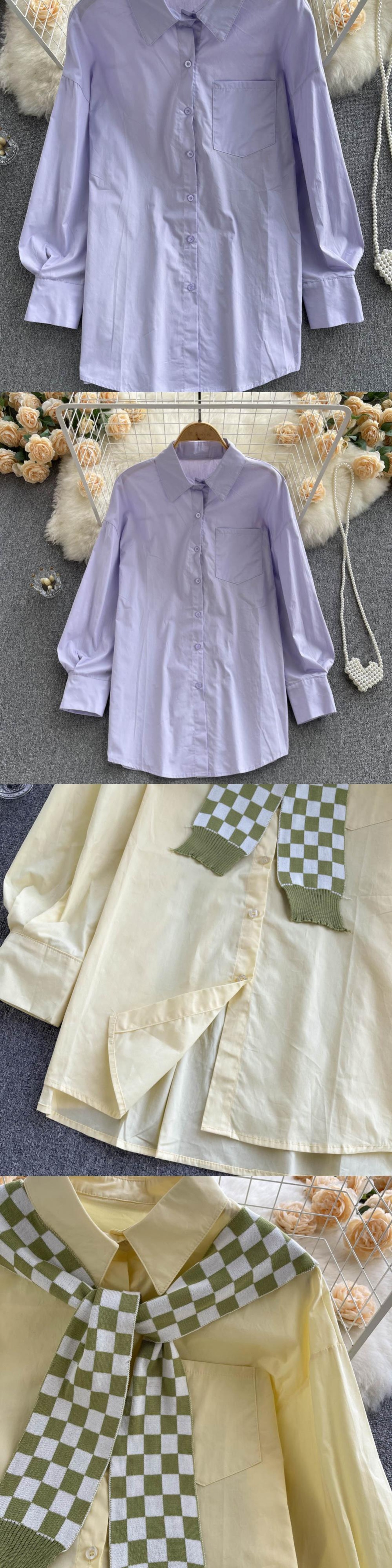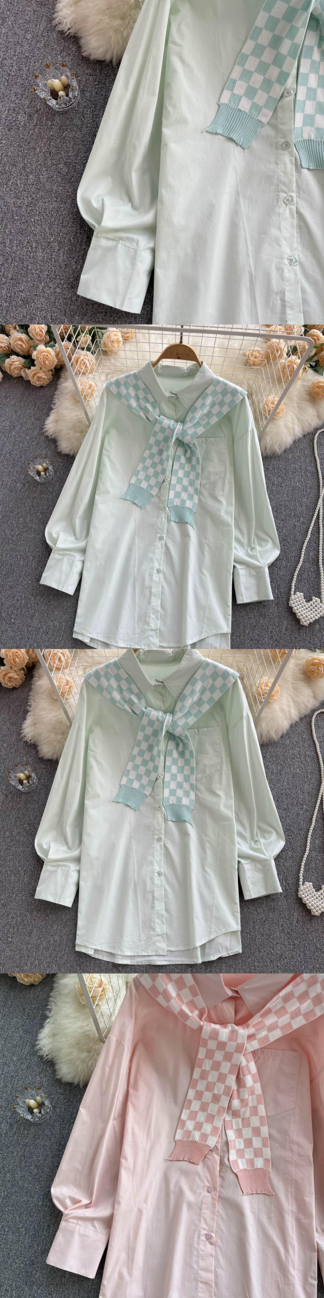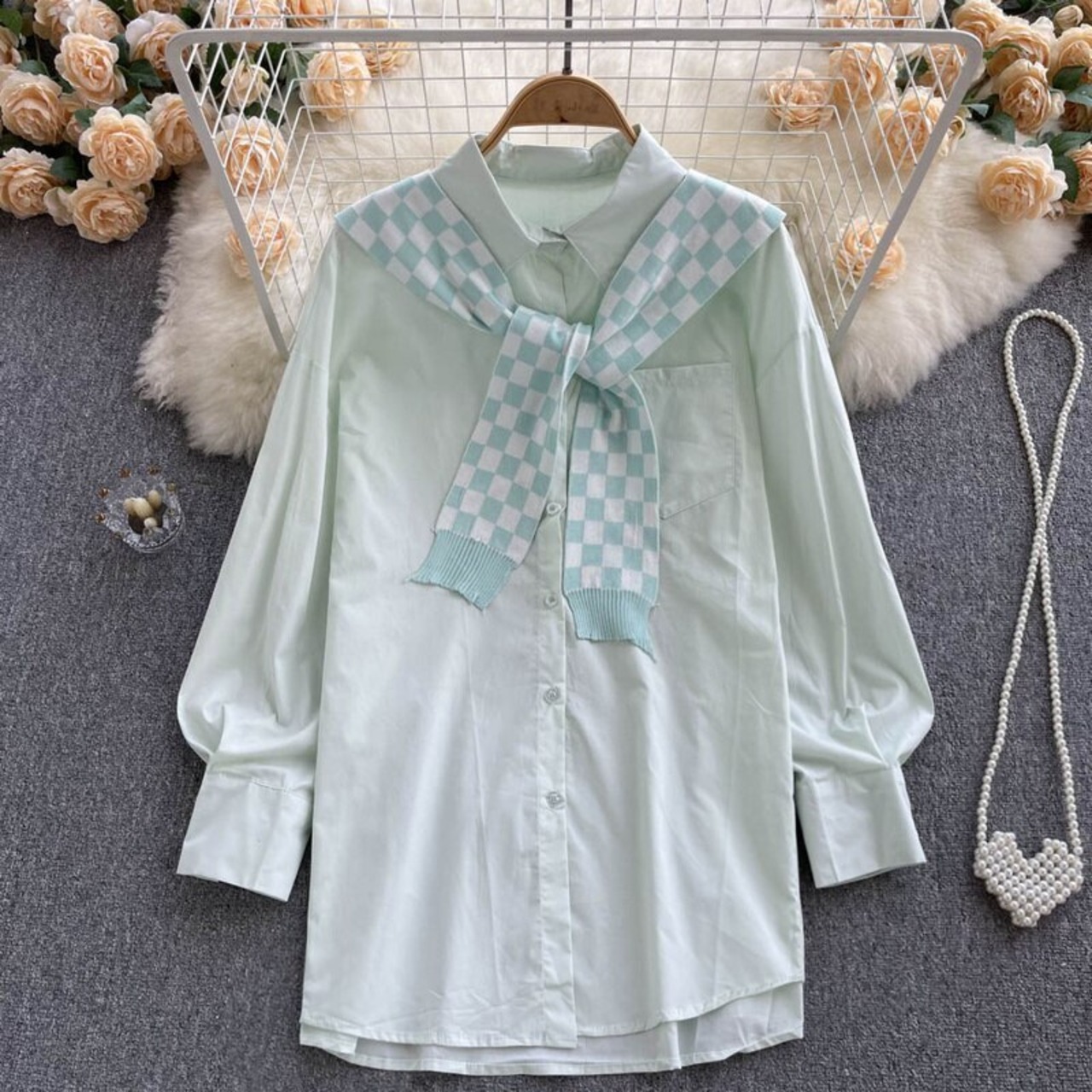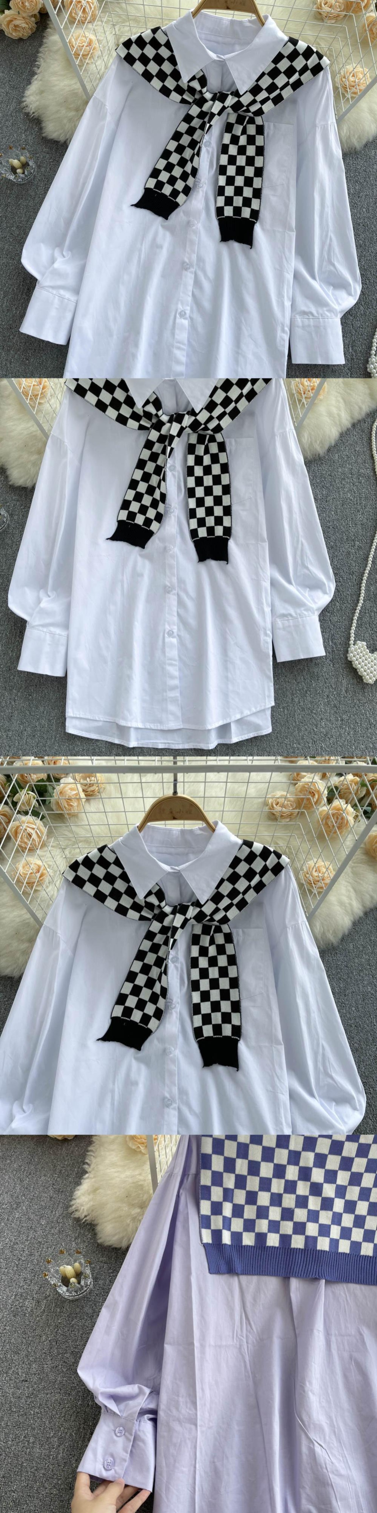 Nomikuma レディース ブラウス スタイル チェック柄ショール + 長袖ターンダウンカラー無地シャツ 2022 秋 2 ピース ロング オータム 秋物 ソリッドカラー kor20427434772