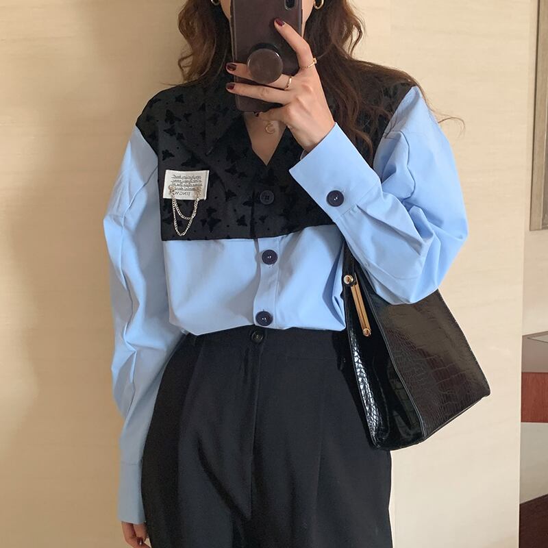 Nomikuma 秋ブラウス女性ターンダウン襟ヒットコロットパッチワーク中空アウトシャツ因果長袖 2022 ロング オータム 秋物 kor18852937920