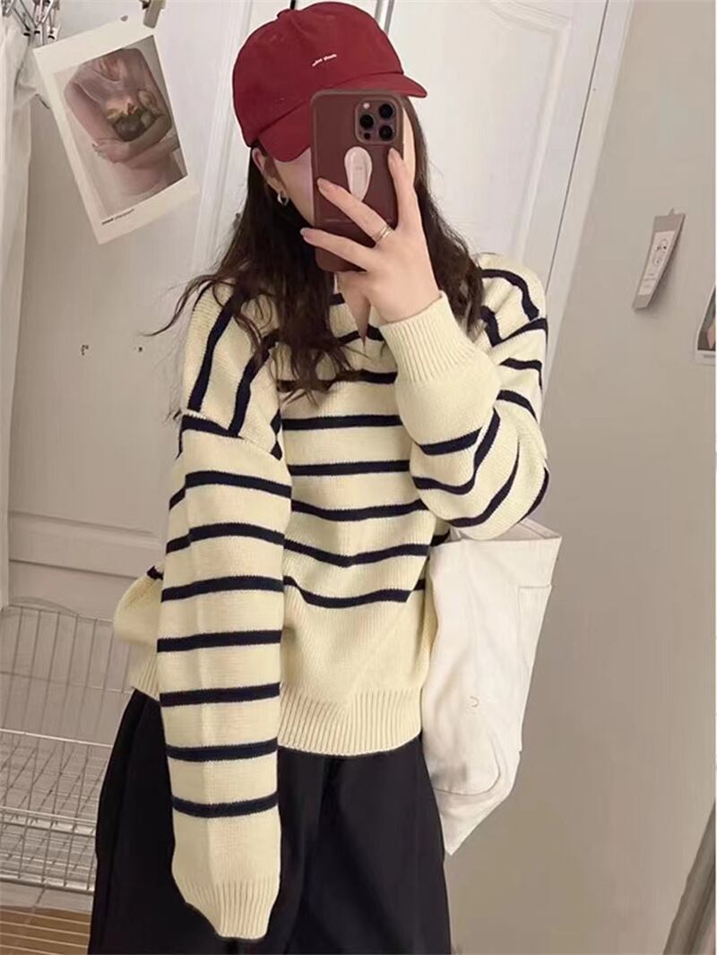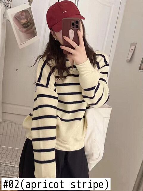 Nomikuam プル 2022 秋冬ターンダウン襟ストライププルオーバートップスニットウェア女性セーター オータム 秋物 ウィンター 冬物 kor76742003310