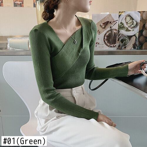 Nomikuma クロス V ネック不規則なニット女性秋冬ベーシックセーター長袖無地スリムストレッチニットトップス ロング オータム 秋物 ウィンター 冬物 Vネック ソリッドカラー kor11193142247
