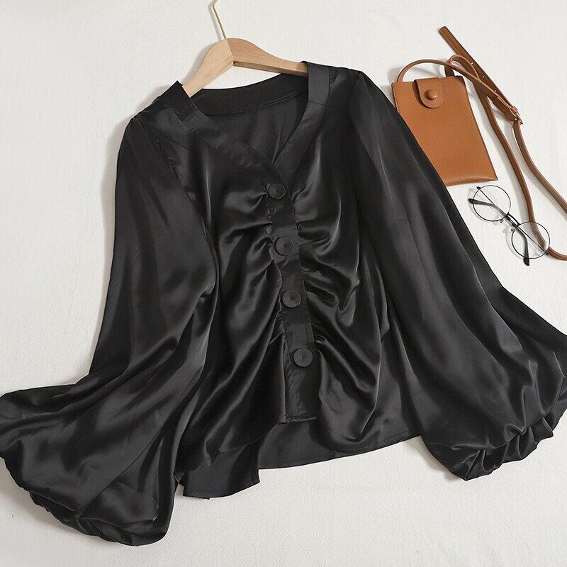 Nomikuma 2022 秋ソリッド V ネックパフスリーブブラウス女性サテンひだシングルブレストデ オータム 秋物 Vネック ソリッドカラー kor30340960690