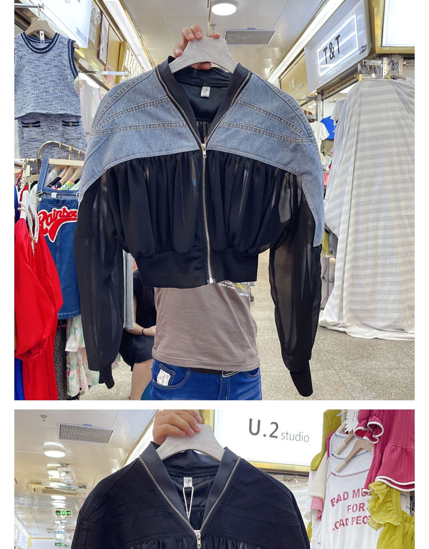 Nomikuma 女性 Jakcet ひだシフォンパッチワークバットウィングスリーブショートコート因果 2022 秋ジッパー V ネック生き抜くトップス オータム 秋物 Vネック kor56166447352