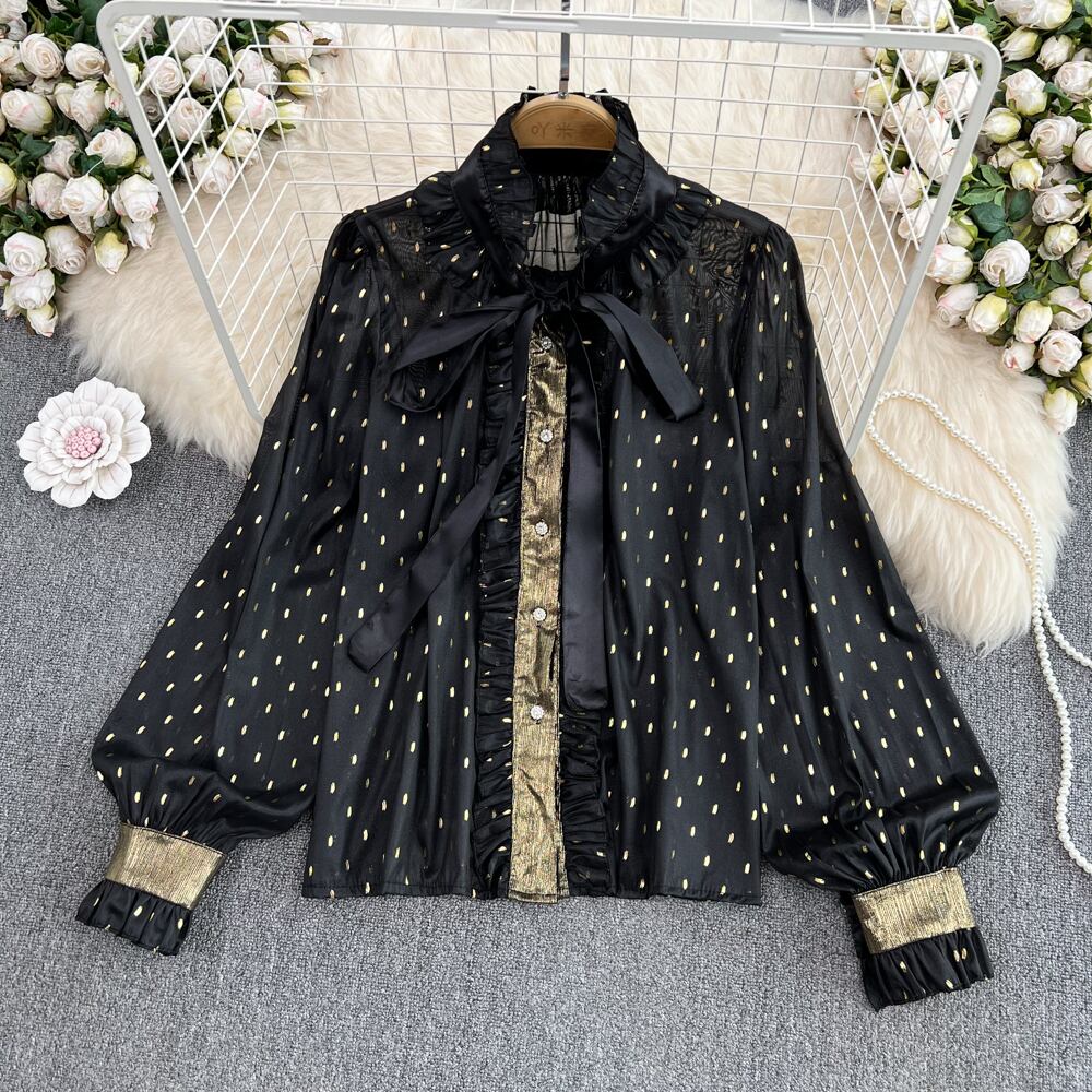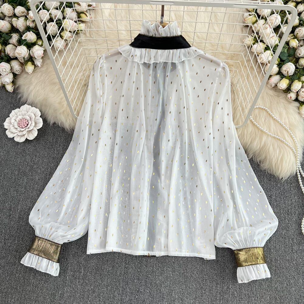 Nomikuma 女性シフォンブラウススタンドネックヒットカラー蝶ネクタイパフスリーブシャツ 2022 秋トップス リボン オータム 秋物 kor49568137333