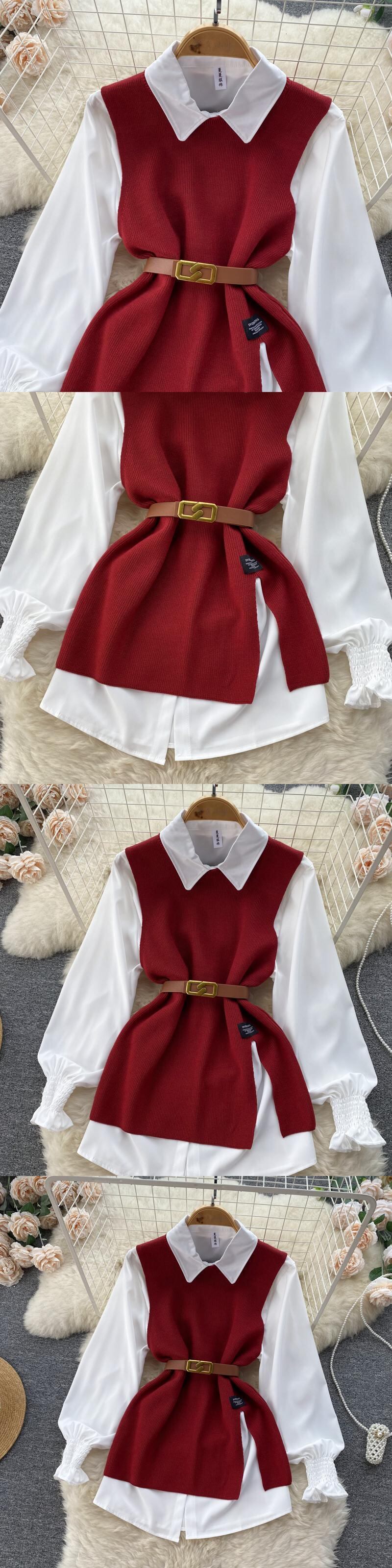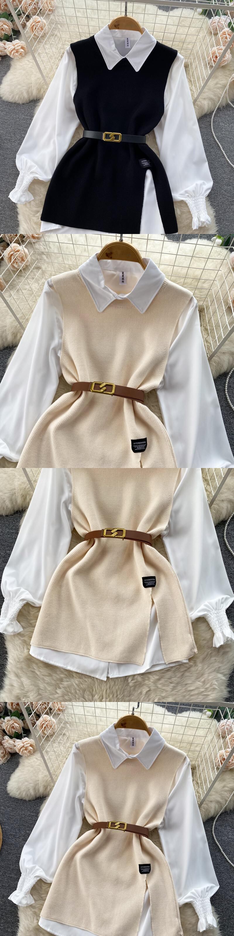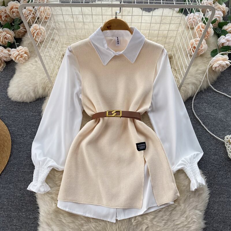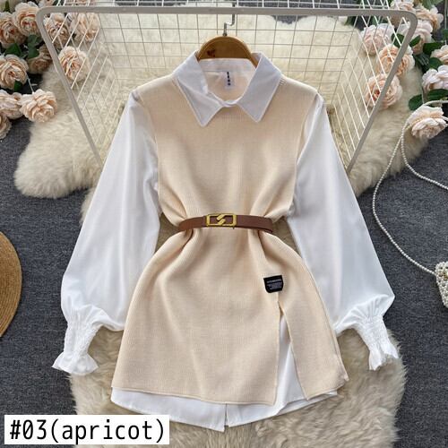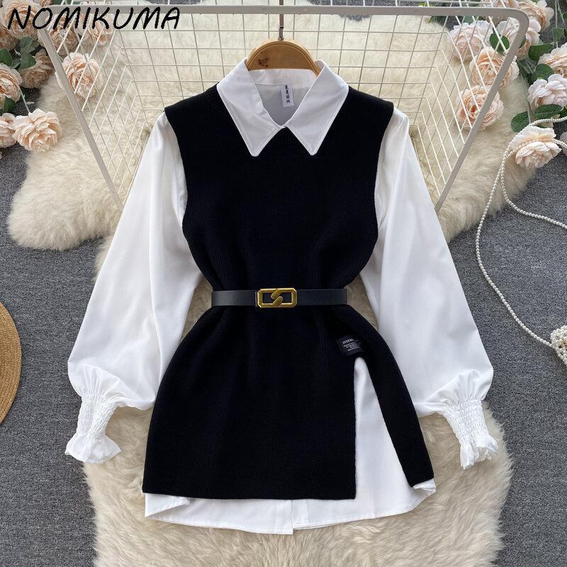 Nomikuma 二枚女性トップセット長袖ターンダウン襟ブラウスシャツ + ベルトスリムウエストニットベスト 2022 秋 ロング オータム 秋物 ハーネス kor97464479105