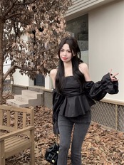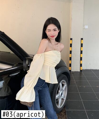 Nomikuma オフショルダー パフ 長袖 スリム ウエスト ショート ブラウス セクシー ストラップレス レディース トップス 2022 秋 ロング オータム 秋物 kor42285941666