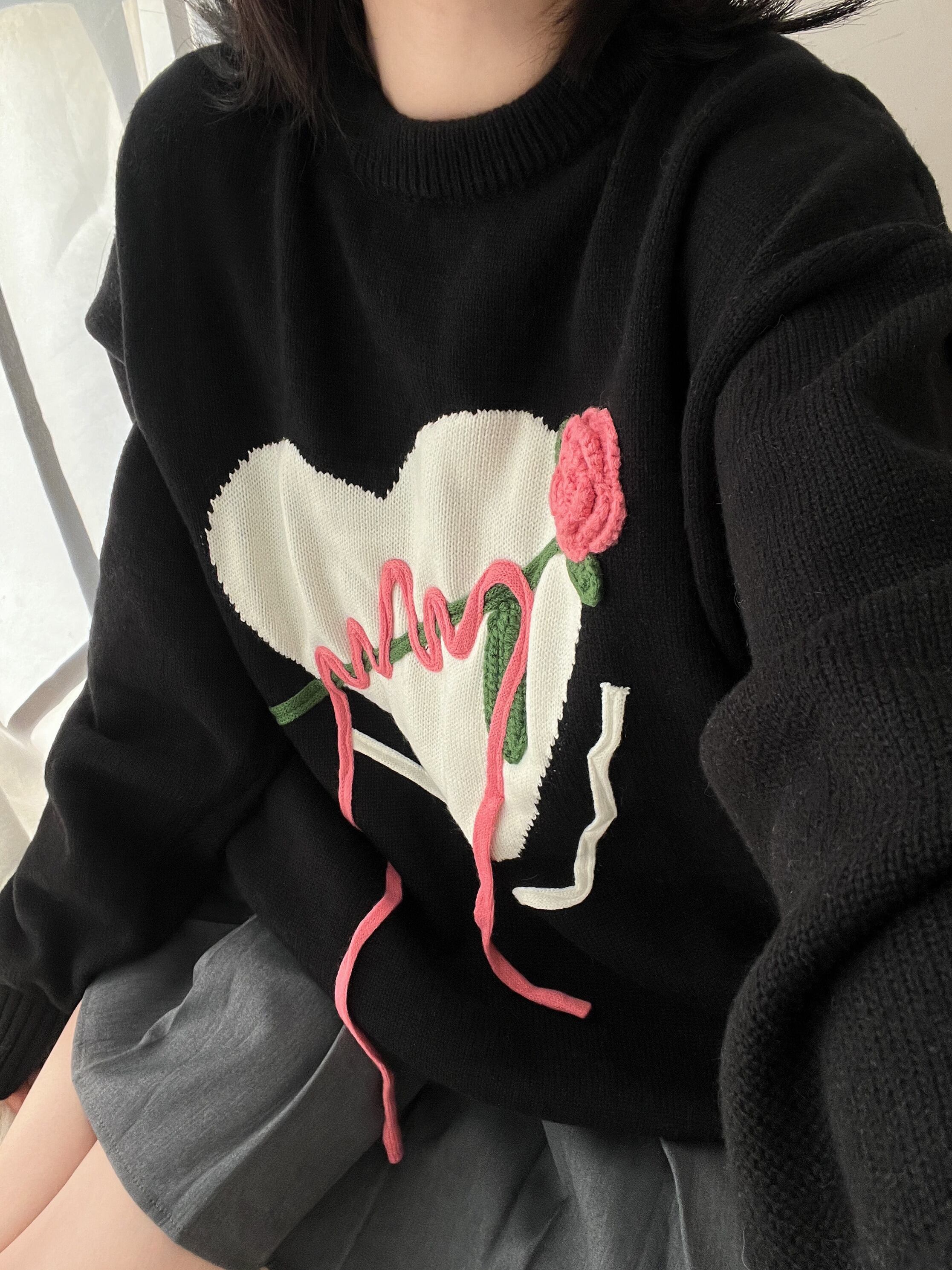 Nomikuma 花リボン女性セーター因果ロング Sleee O ネックプル秋冬 2022 ニットトップス オータム 秋物 ウィンター 冬物 Oネック フラワーデザイン kor40231582833