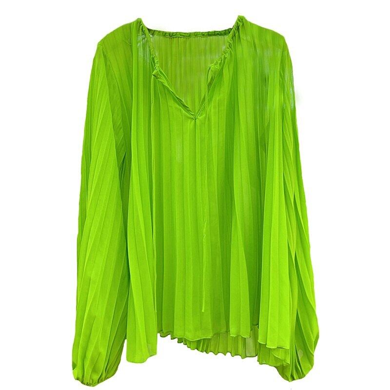 ノミクマ 2022秋 カジュアル プルオーバー レースアップ Vネック シフォン ブラウス シャツ 長袖 無地 ひだ トップス ロング オータム 秋物 ソリッドカラー kor72037254126