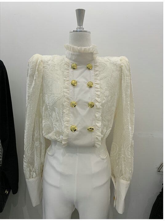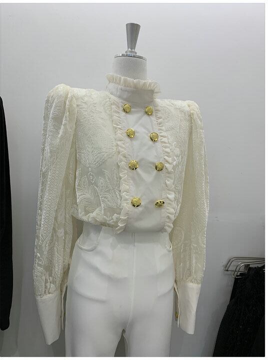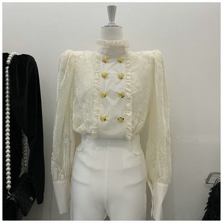 Nomikuma スタンドネックパッチワークベロアシャツ 2022 秋パフスリーブ女性ダブルブレストプルオーバートップス オータム 秋物 kor63835930874