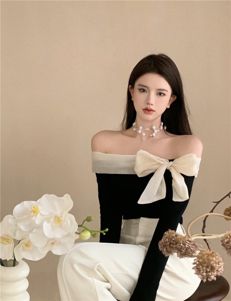 Nomikuma 2022 秋の女性 Tシャツヒットカラー弓包帯オフショルダーセクシーなストラップレススリム長袖グラフィック Tシャツ ロング リボン オータム 秋物 kor49359967770