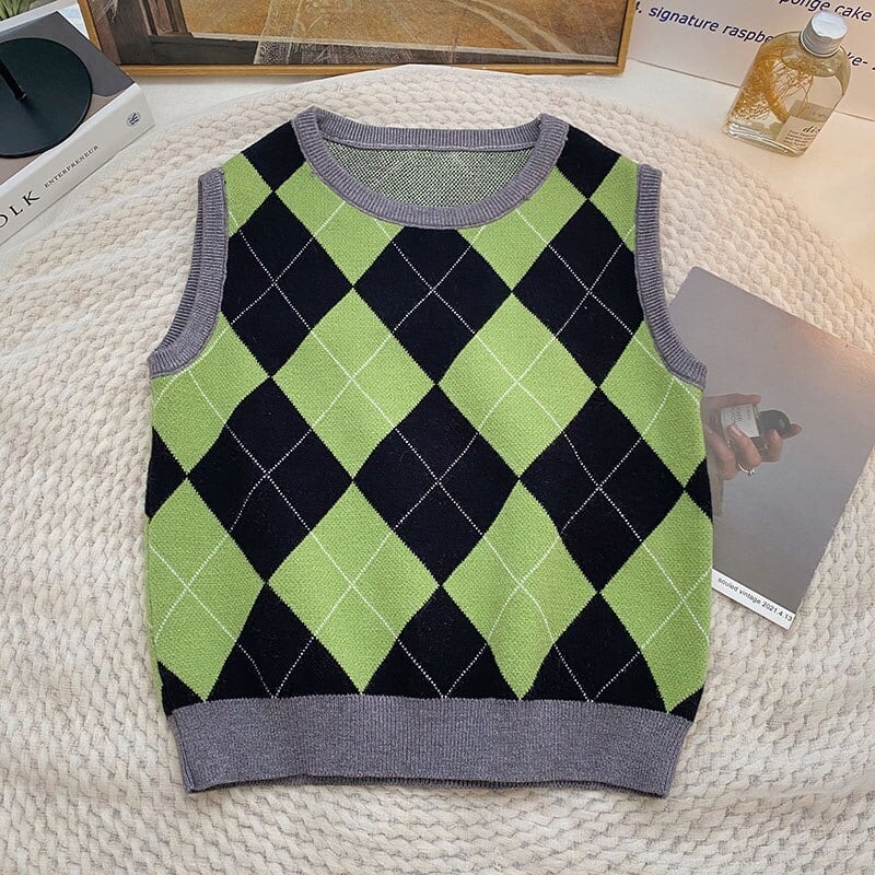 草引コントラストカラーアーガイルショートニットベスト女性 2022 秋のチョッキ因果 O ネックノースリーブセータートップス オータム 秋物 Oネック kor25874305441