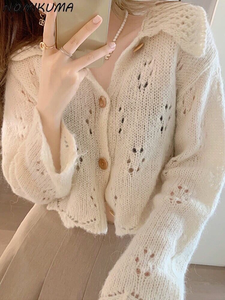 Nomikuma 2022 秋ニット女性カーディガン中空アウトターンダウン襟セータートップス因果ショートニットコート オータム 秋物 kor57616620750