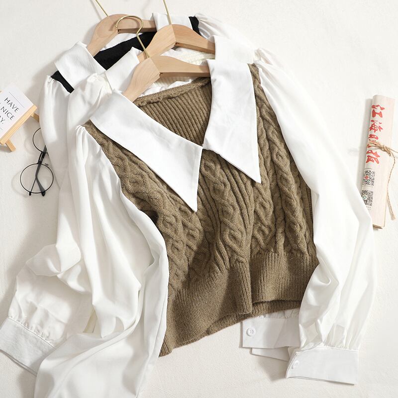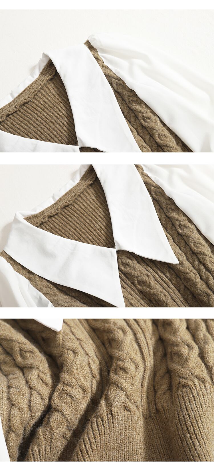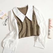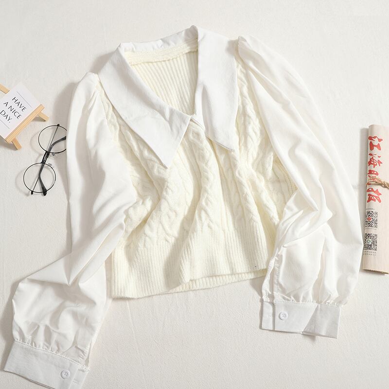 Nomikuma 2022 秋ニットパッチワークレディーストップス甘いピーターパン襟パフスリーブブラウスシックなショートシャツ 大人ガーリー スウィート キュート カジュアル オータム 秋物 kor53547792851
