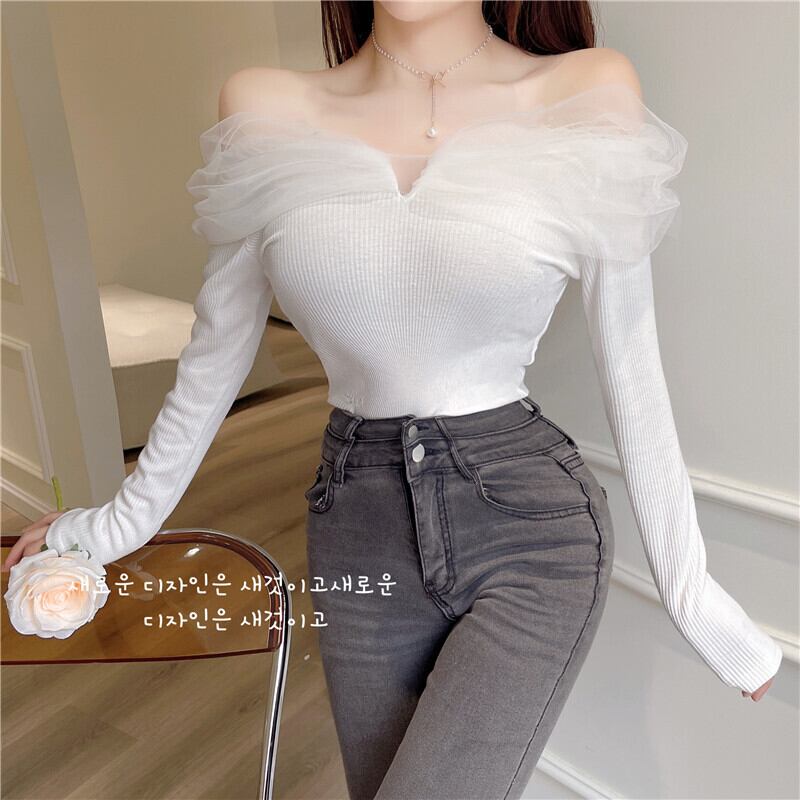 Nomikuma シックなガーゼパッチワークオフショルダー女性 Tシャツ長袖スリム秋の基本的なトップス 2022 秋のグラフィック Tシャツ ロング オータム 秋物 kor98672055732