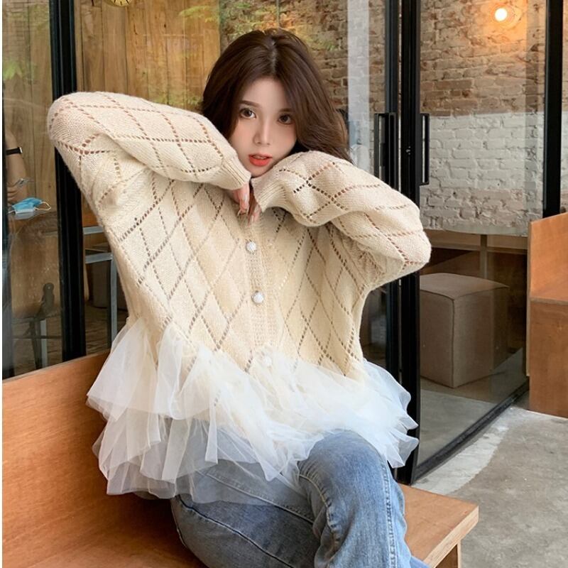 KUSAHIKI 2022 ガーゼ フリル パッチワーク ニット カーディガン女性長袖 O ネック甘いセーター ニット コート ロング 大人ガーリー スウィート キュート カジュアル Oネック kor75324715795