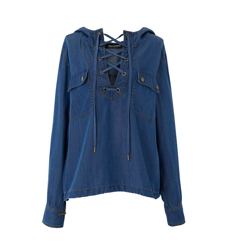 Nomikuma 2022 秋フード付き Demin ブラウスクロス包帯無地プルオーバートップス因果長袖ジーンズシャツ ロング オータム 秋物 ソリッドカラー kor67470434918