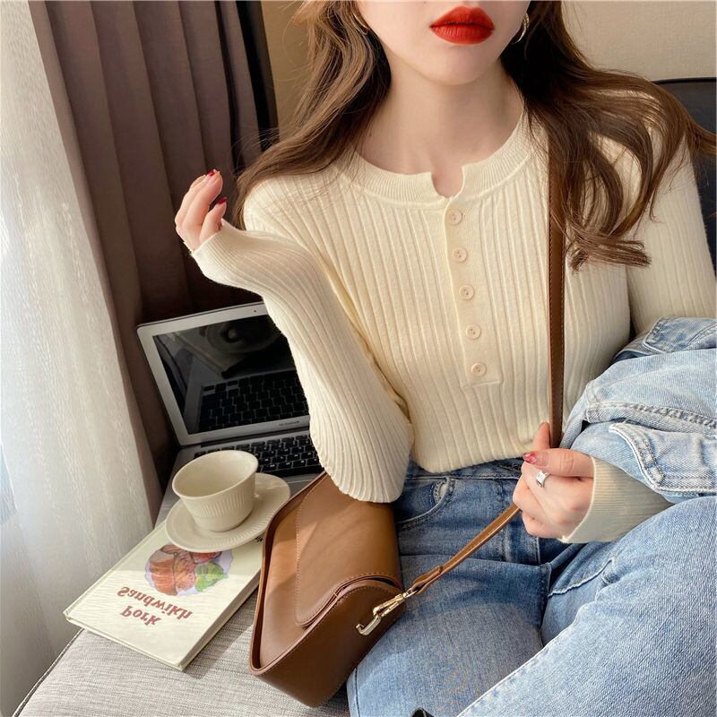 Nomikuma ニット女性秋冬 2022 ベーシックニットトップス長袖ボタン O ネックセクシーなスリムプルオーバーセーター ロング オータム 秋物 ウィンター 冬物 Oネック kor27490063985