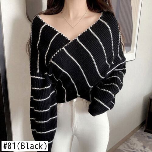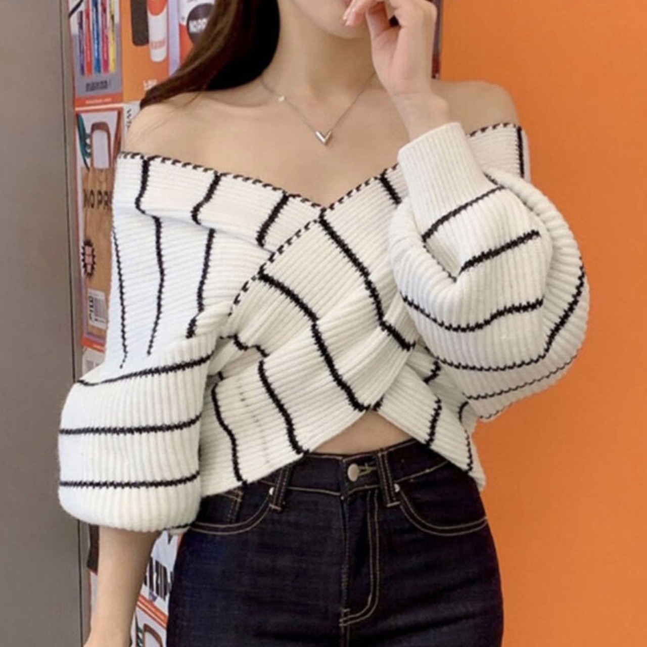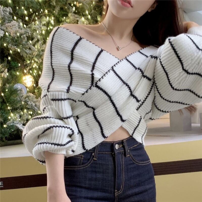 ノミクマ シック 秋冬 クロス Vネック ヒットカラー ストライプ セーター 長袖 スリムウエスト プルオーバー ニット ロング オータム 秋物 ウィンター 冬物 kor13790138476