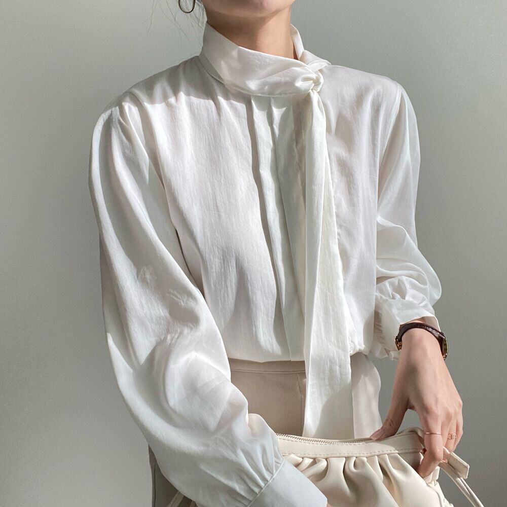 ノミクマ スタンドネック リボン レディース トップス パフ ロング ルシーブ 無地 シャツ 2022年 秋 ブラウス オータム 秋物 ソリッドカラー kor68539502661