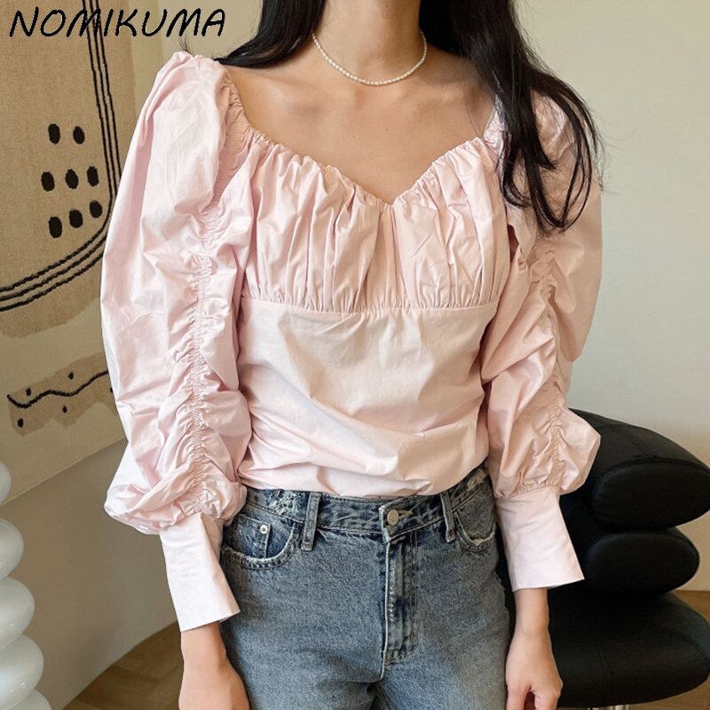 Nomikuma スクエアカラーひだ女性シャツ秋のパフスリーブソリッドスウィートブラウス女性 2022 大人ガーリー キュート カジュアル オータム 秋物 ソリッドカラー スクウェア kor27915808516
