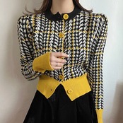 ノミクマ シック Oネック ヒットカラー 鳥格子セーター コート スリムウエスト パフスリーブ 秋 ニット カーディガン オータム 秋物 kor89155932634