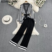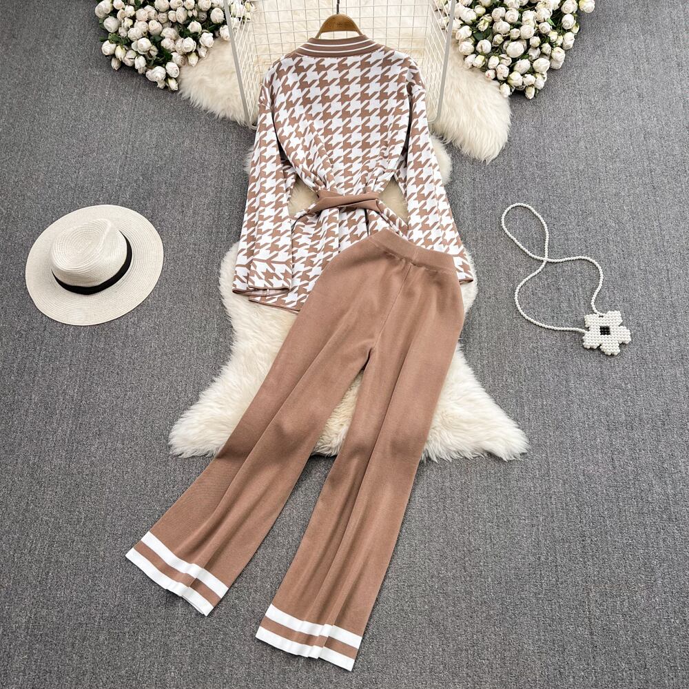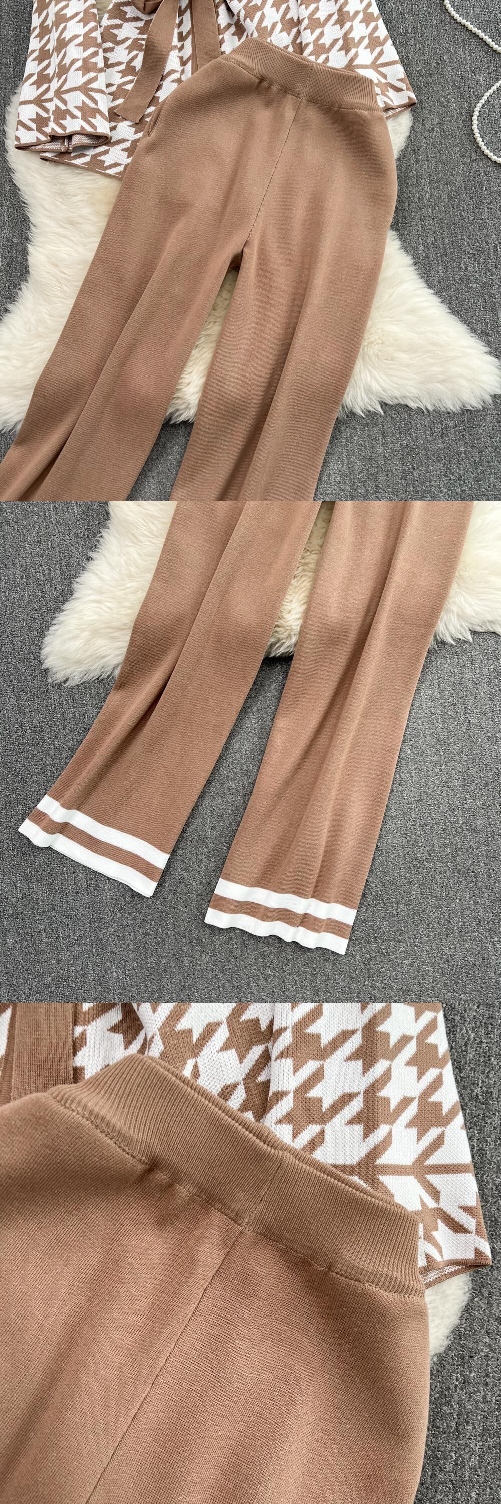 Nomikuma ニットセット女性 V ネック鳥格子弓包帯カーディガンコート + ウエストワイドレッグセーターパンツ リボン Vネック ワイドパンツ kor73059789618