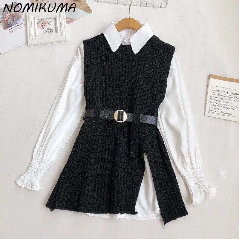 Nomikuma ニットウェア レディース 2022 秋冬 ベーシック 長袖 ブラウス + ニットベスト ベルト スリムウエスト 2点セット ロング オータム 秋物 ウィンター 冬物 ハーネス kor94945538457