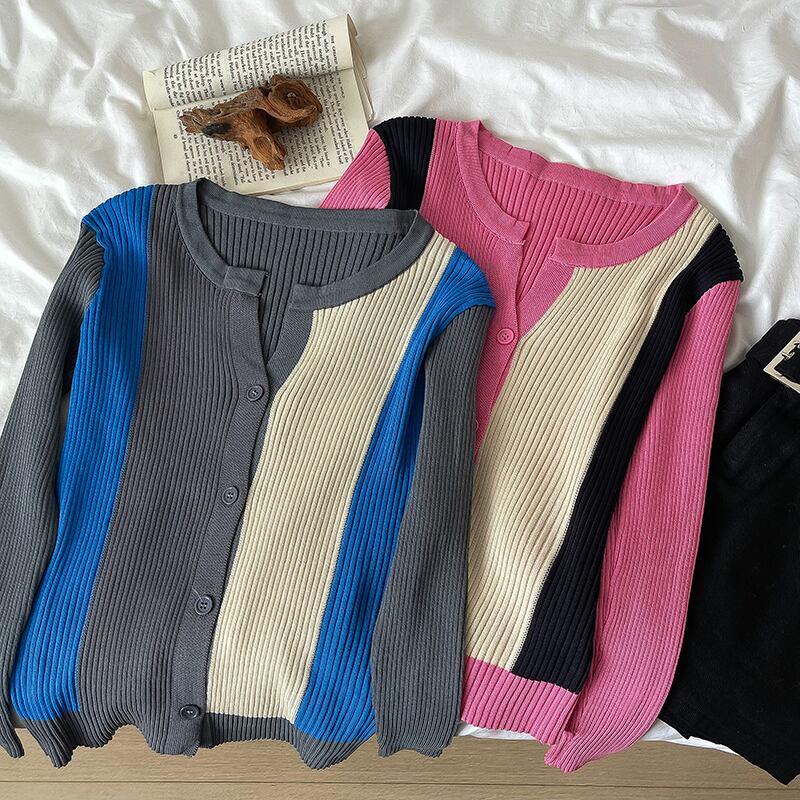 Nomikuma ヒットカラーパッチワークニット 2022 秋の女性シングルブレスト O ネック長袖ニットセーターカーディガン ロング オータム 秋物 Oネック kor16745740010