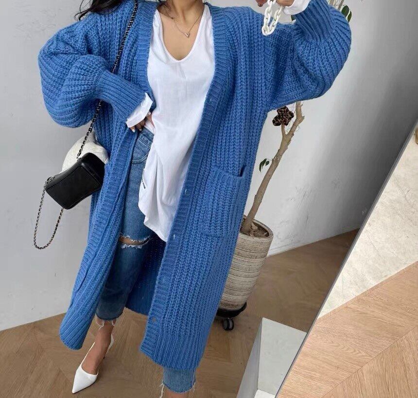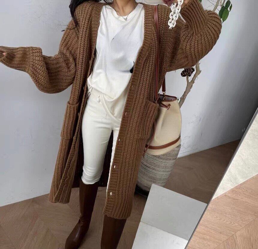 ノミクマ秋冬カジュアルポケットミディアムロングニットカーディガン2022無地ロングスリーブVネックセーターコート オータム 秋物 ウィンター 冬物 ソリッドカラー kor25010308849