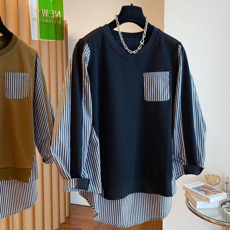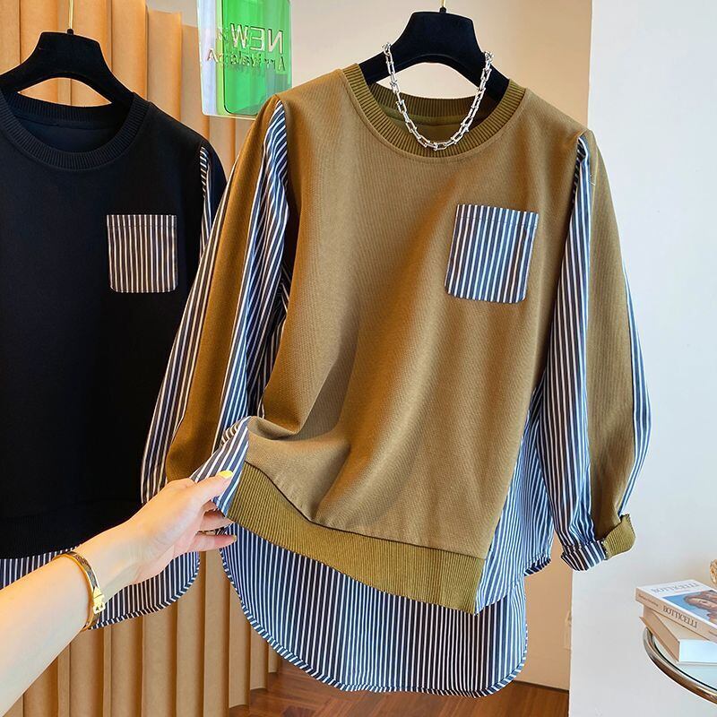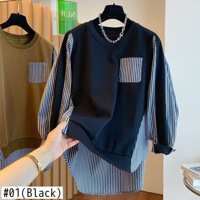 Nomikuma 因果ストライプブラウスパッチワークスウェットレディース秋プルオーバーパーカートップ 2022 長袖 O ネックジャンパー ロング シャツ オータム 秋物 Oネック kor94082076126