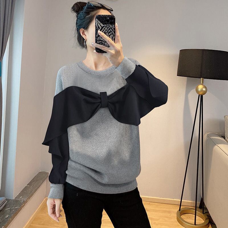 Nomikuma ヒットカラーパッチワークちょう結びニット女性秋冬プル 2022 長袖 O ネックプルオーバーニットセーター ロング リボン オータム 秋物 ウィンター 冬物 Oネック kor6473266615