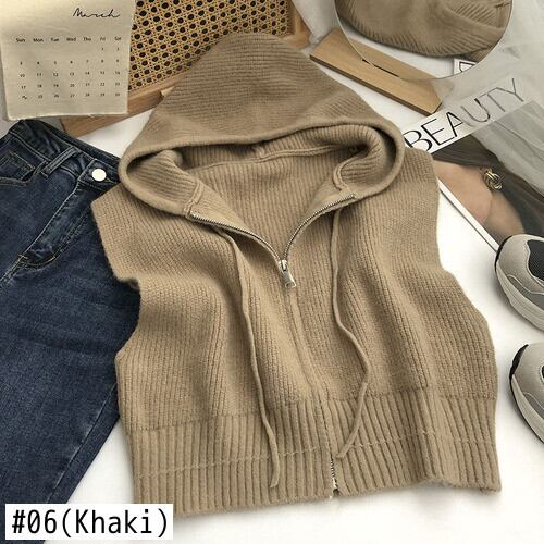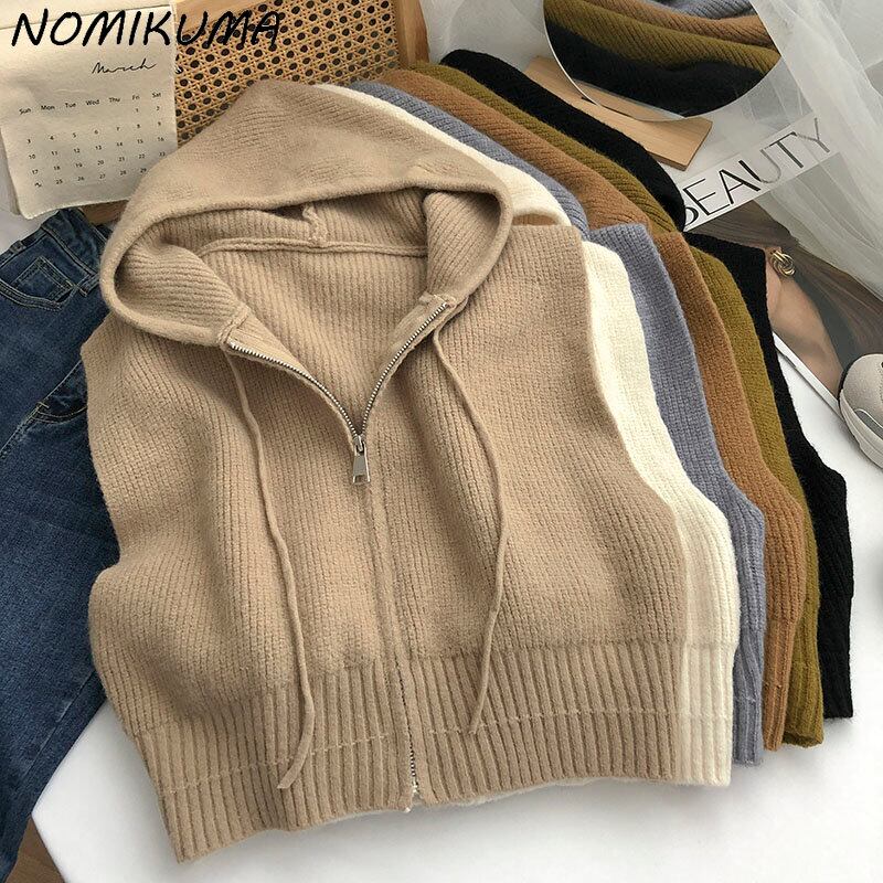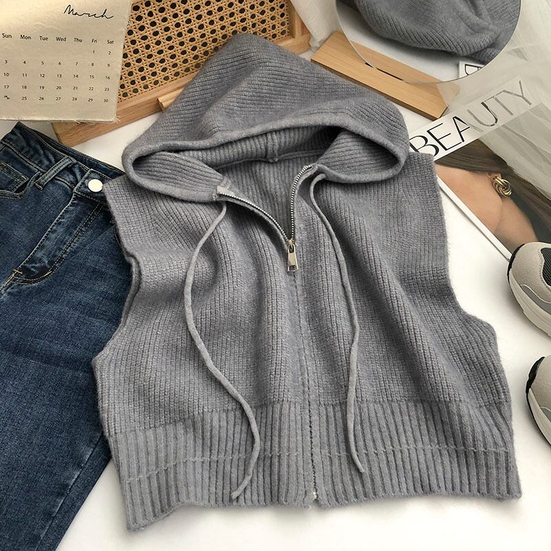 Nomikuma 巾着フード付きジッパーノースリーブニットベストコート女性 2022 秋の女性ショートセーターチョッキ オータム 秋物 kor53131369449