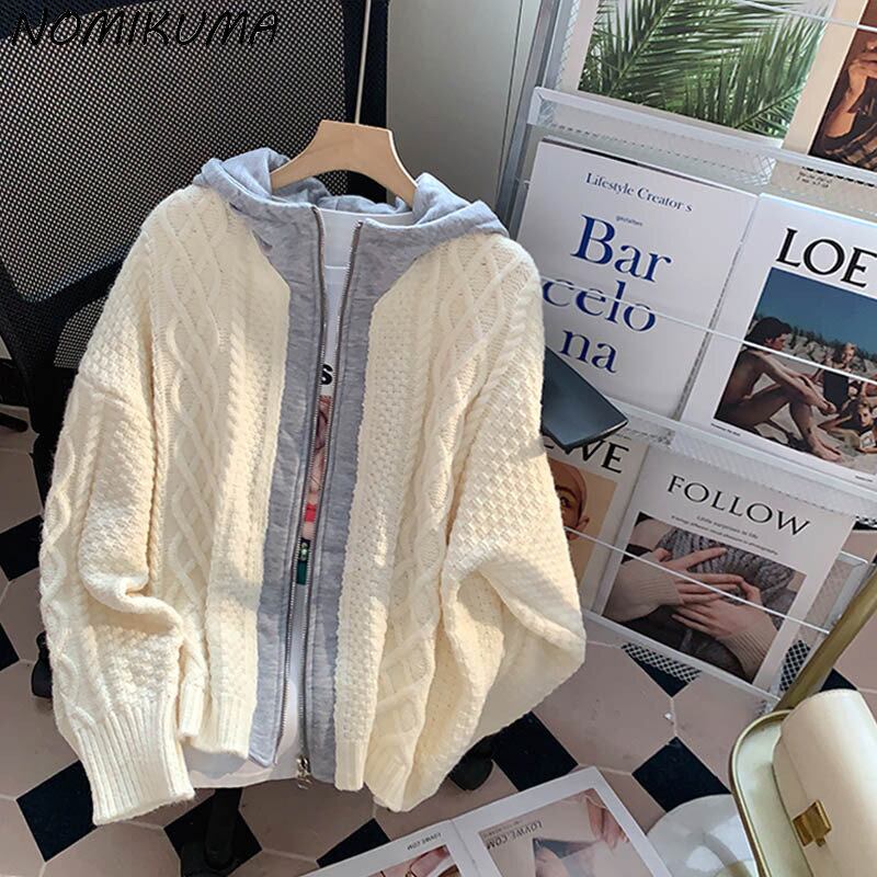 Nomikuma コントラストカラーフード付きツイストセーターコート女性 2022 秋の因果ジッパー長袖ニットカーディガンジャケット ロング オータム 秋物 kor88911795844