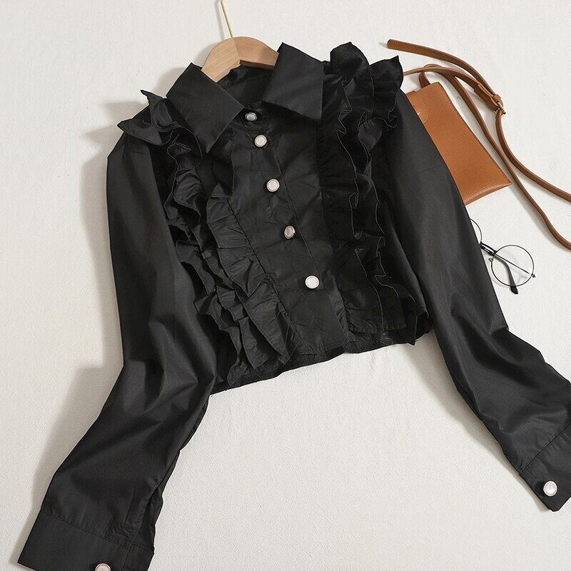 Nomikuma 2022 秋シックなフリルパッチワークレディーストップ長袖ターンダウンカラーシャツ甘いショートトップ ロング 大人ガーリー スウィート キュート カジュアル オータム 秋物 kor69989870243