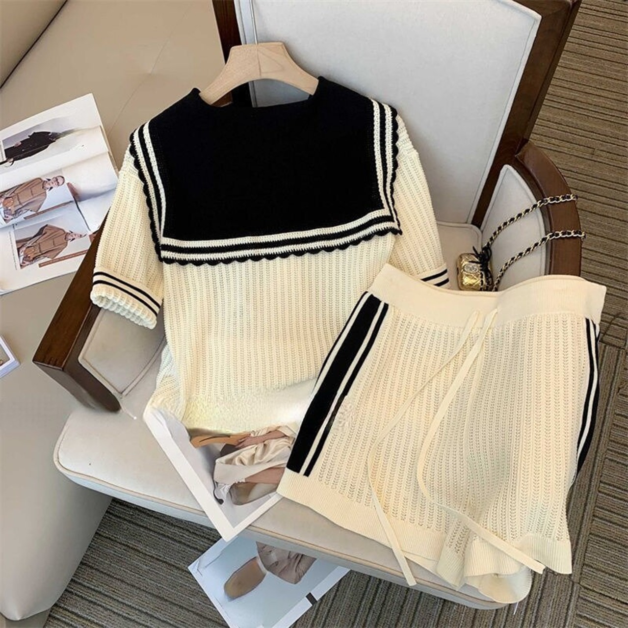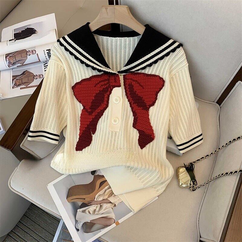ノミクマ2点セットシックなヒットカラーちょう結びセーラーカラープルオーバートップス+レースアップウエストワイドレッグショーツ2022 リボン ブルマー ワイドパンツ kor90498200008