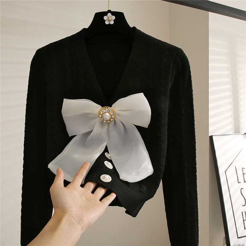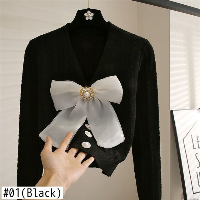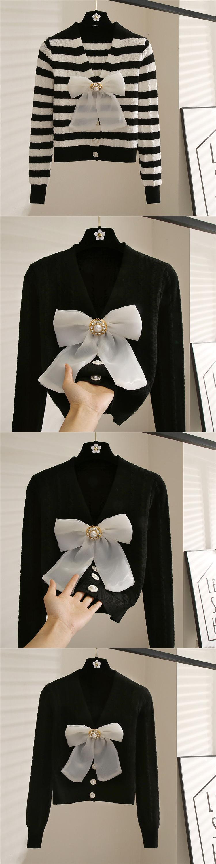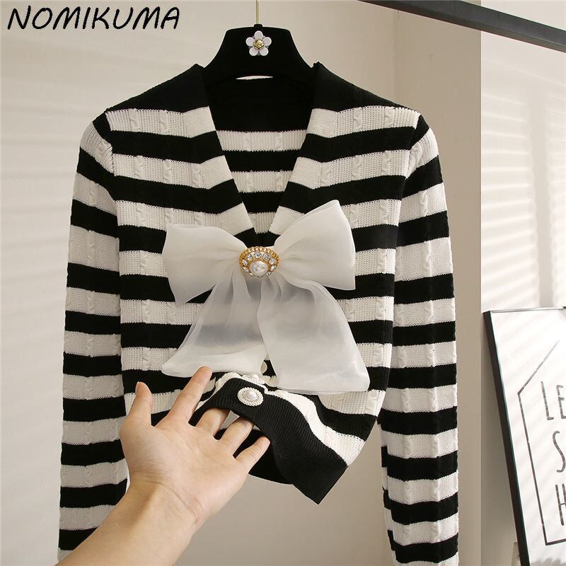Nomikuma シックなビーズちょう結び甘いセーターコートストライプ長袖 V ネックニット 2022 秋の女性ニットカーディガン ロング リボン 大人ガーリー スウィート キュート カジュアル オータム 秋物 Vネック kor87972844409