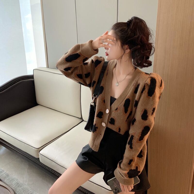 Nomikuma ヒョウニットカーディガンコート因果パフ長袖 V ネックセーター 2020 女性ニットジャケット 6D728 ロング Vネック kor61039501091
