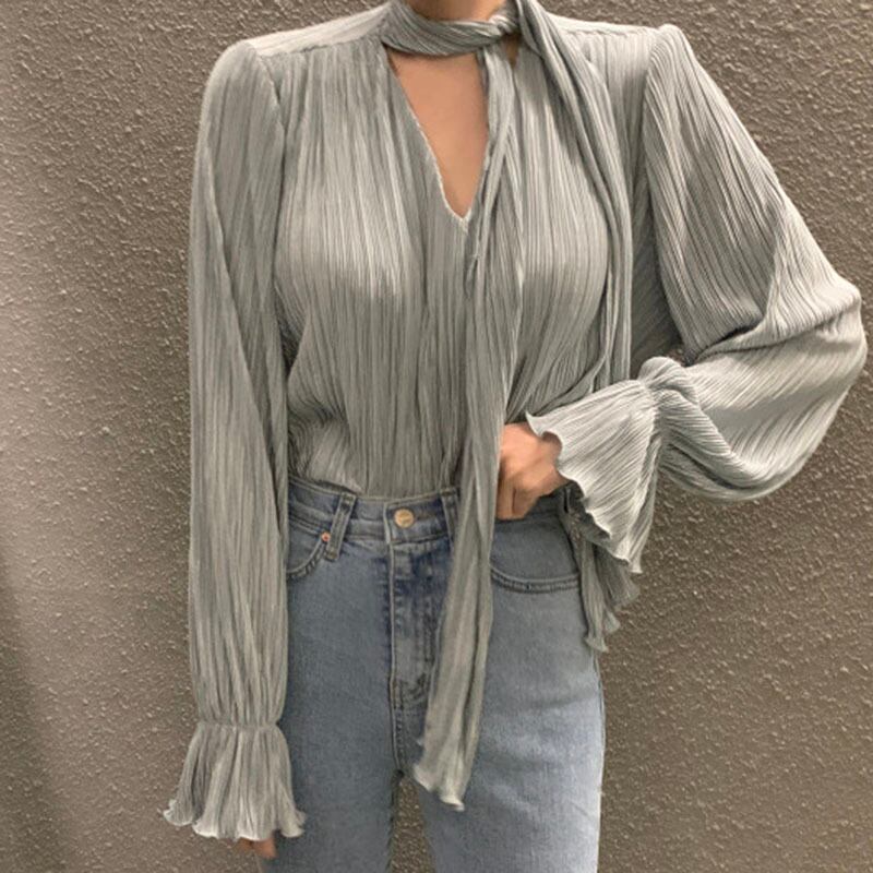 Nomikuma 女性トップスひだ因果フレアスリーブブラウスシャツ 2022 春レースアップ V ネックプルオーバーデモーダ スプリング 春物 Vネック kor43145761345