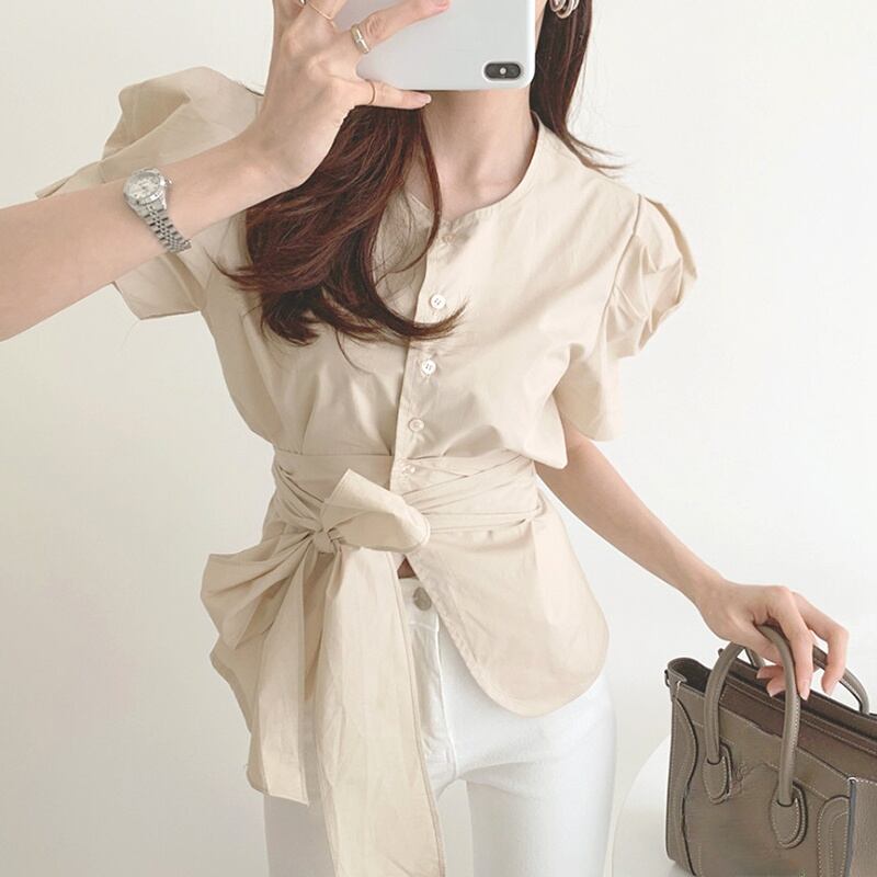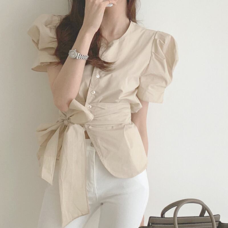ノミクマシックサマーパフスリーブブラウスボウバンデージスリムウエストシャツシングルブレストトップ6G645 リボン 夏物 kor58552527671