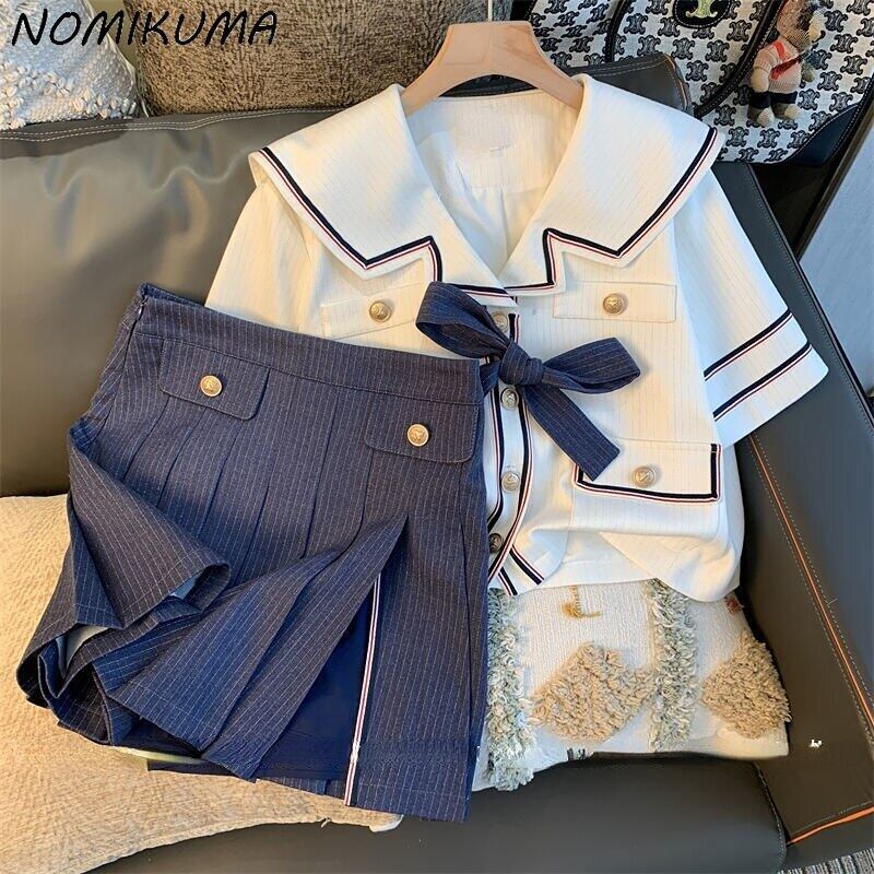 Nomikuma Sweet 2022 夏 2 ピース女性セットシックなちょう結びセーラー襟半袖トップ + ウエストプリーツミニスカート ショート リボン ハーフスリーブ 大人ガーリー スウィート キュート カジュアル サマー 夏物 kor72718817385
