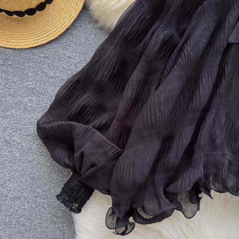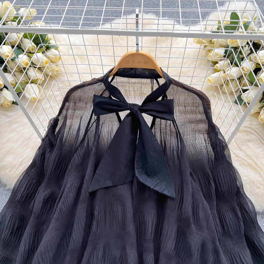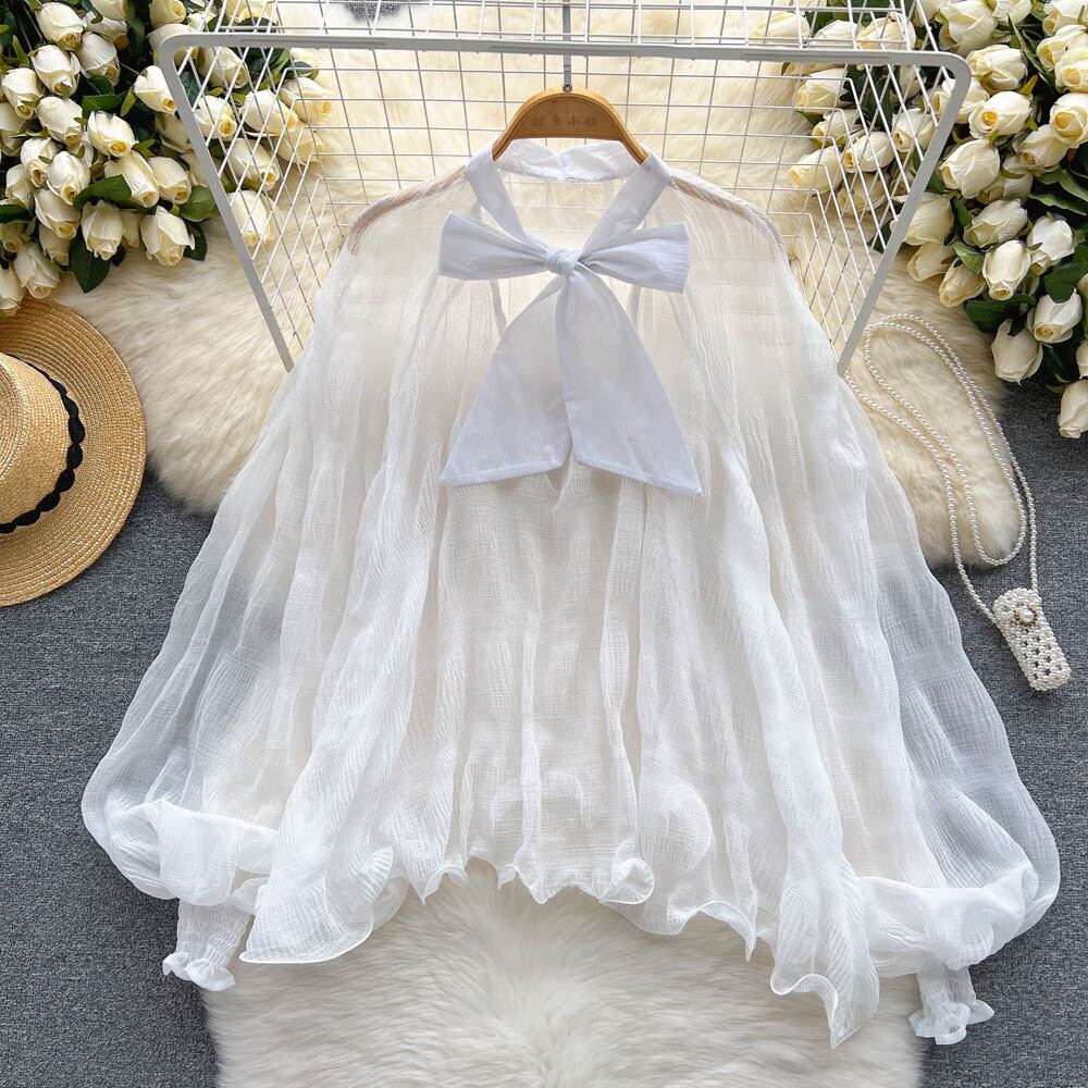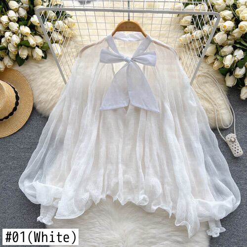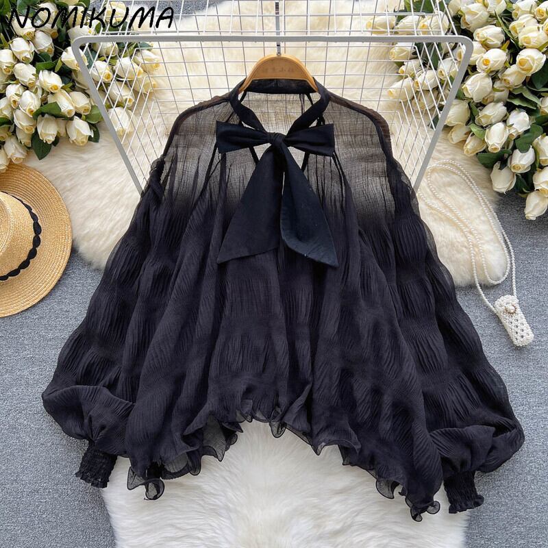Nomikuma シフォンパフ長袖ブラウス女性 2022 蝶ネクタイ V ネックトップス因果無地薄いシャツデ ロング リボン Vネック ソリッドカラー kor24279977588