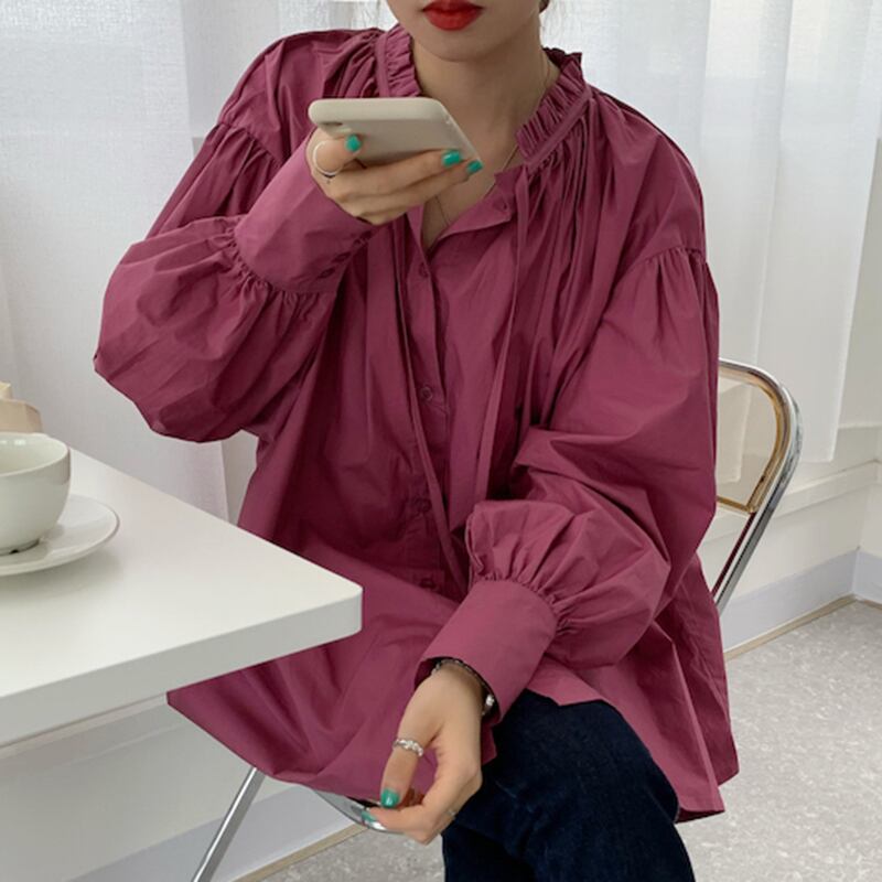 Nomikuma シックな蝶ネクタイスタンドネックドールシャツランタンスリーブ女性ブラウス 2021 秋トップ 6L557 リボン kor24613485344