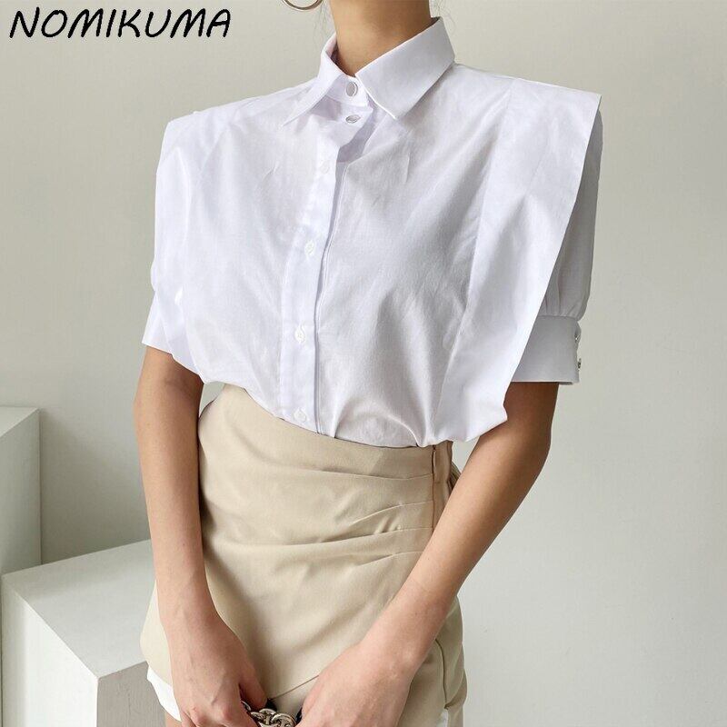 ノミクマ 2021 レディース ブラウス 半袖 ターンダウンカラー シックシャツ 因果無地 デモーダ 6K036 ショート ハーフスリーブ ソリッドカラー kor74928217056