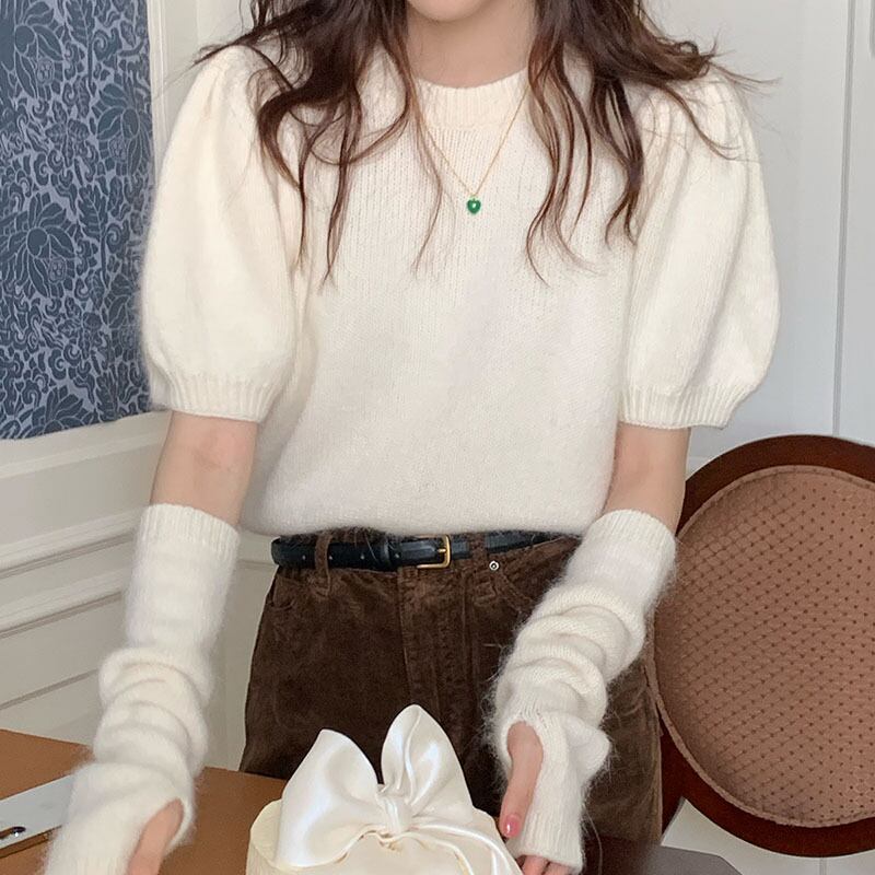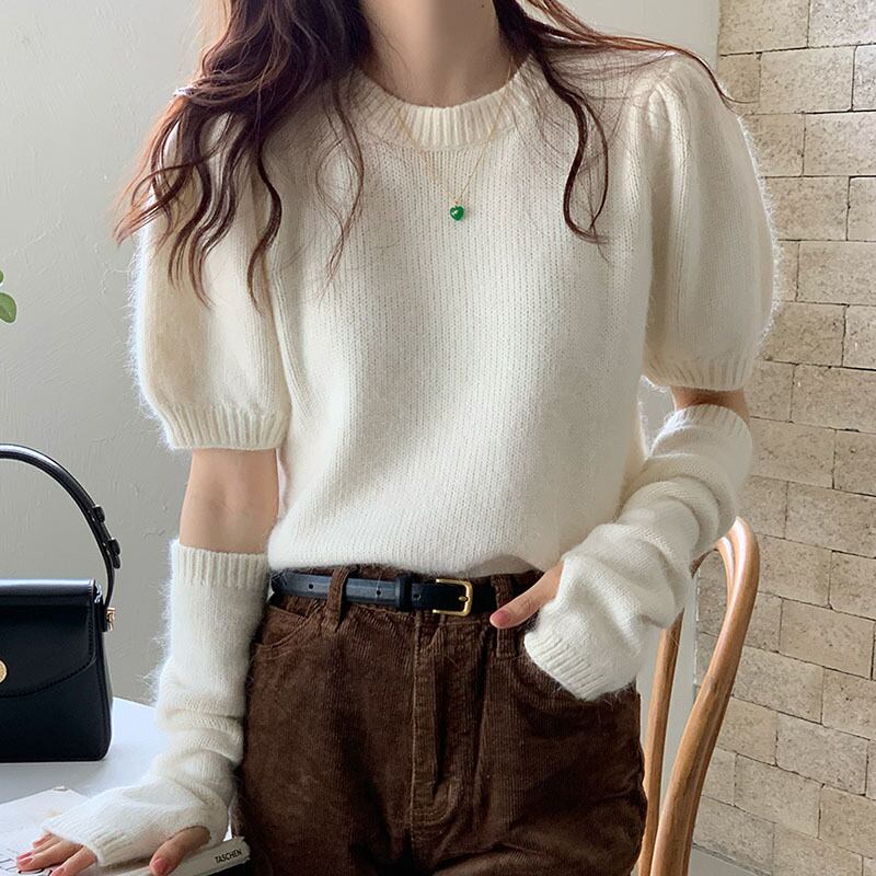 Nomikuma シックなショートニットセーター因果 O ネックパフスリーブ甘いプルオーバー Knitwed トップス春 2022 女性ニット 大人ガーリー スウィート キュート カジュアル スプリング 春物 Oネック kor50119647296